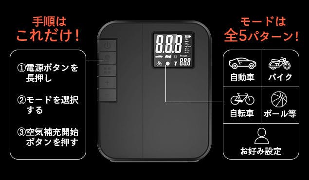設定値に達すると自動停止されるため、「このくらいでいいかな?まだ足りないかな?」と、空気の過不足を気にすることもありません。