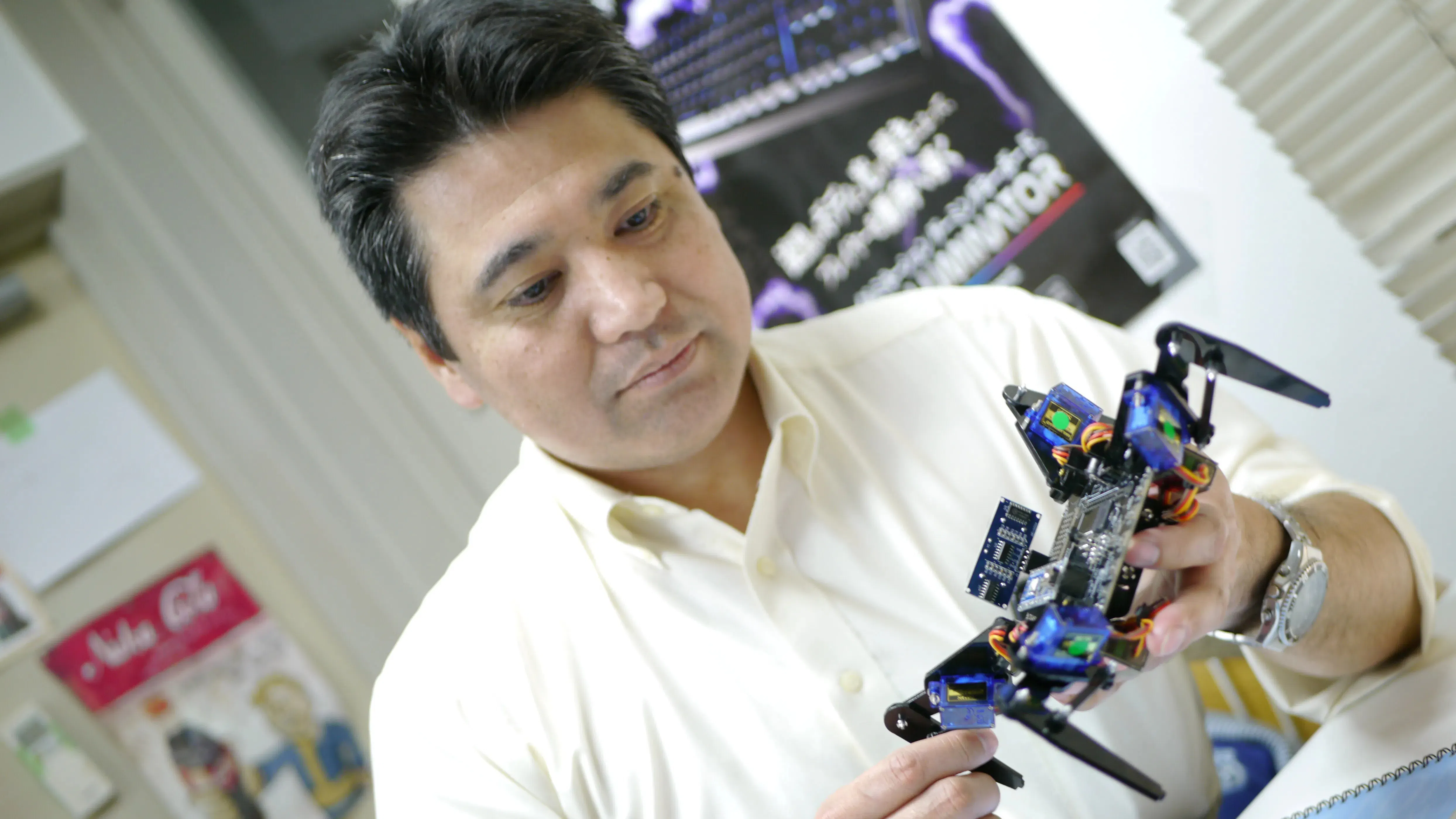 OA機器メーカーでエレクトロニクス関連業務に従事するその側らで、趣味でマイコン基板などの設計・製作や、電子工作でちょっと変わった小型ロボットを製作。