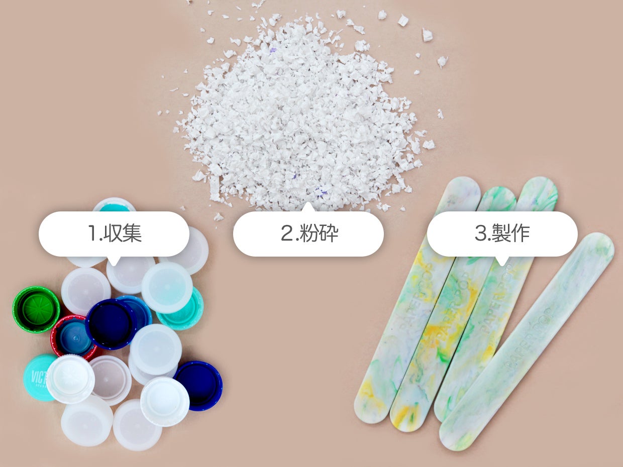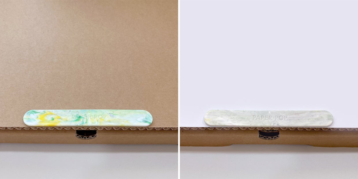 ペーパーポップはリサイクルの難しいプラスチックを粉砕しストレージスタンドの付属品として生まれ変わらせました。
