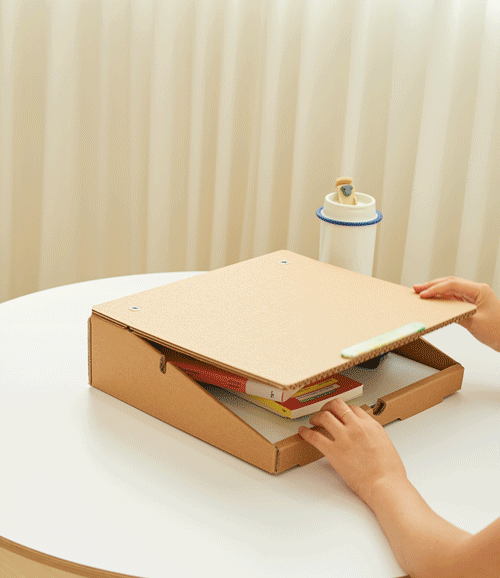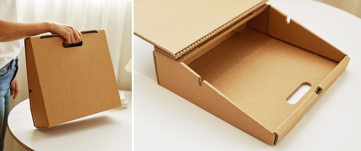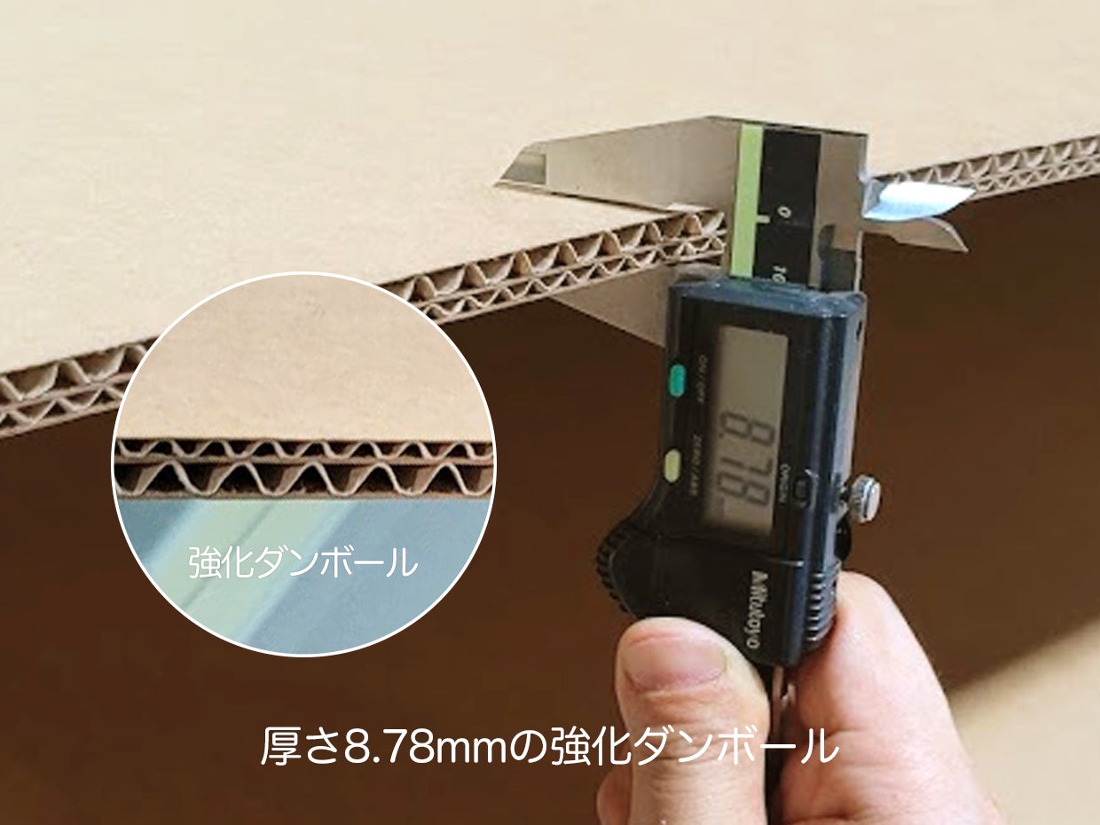長時間の重さがかかっても耐えられるように厚さ8mmの強化ダンボールで、一般に市販されている段ボールと違い、パルプ紙の比率を高めてより丈夫な作りとなっています。