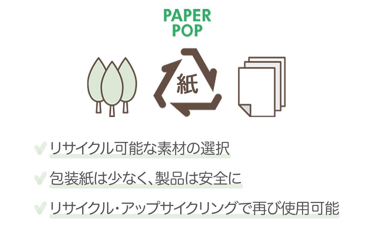ペーパーポップは廃棄が難しい素材の代案として、50%以上リサイクルできる紙を選んで様々な日常の物を作ります。