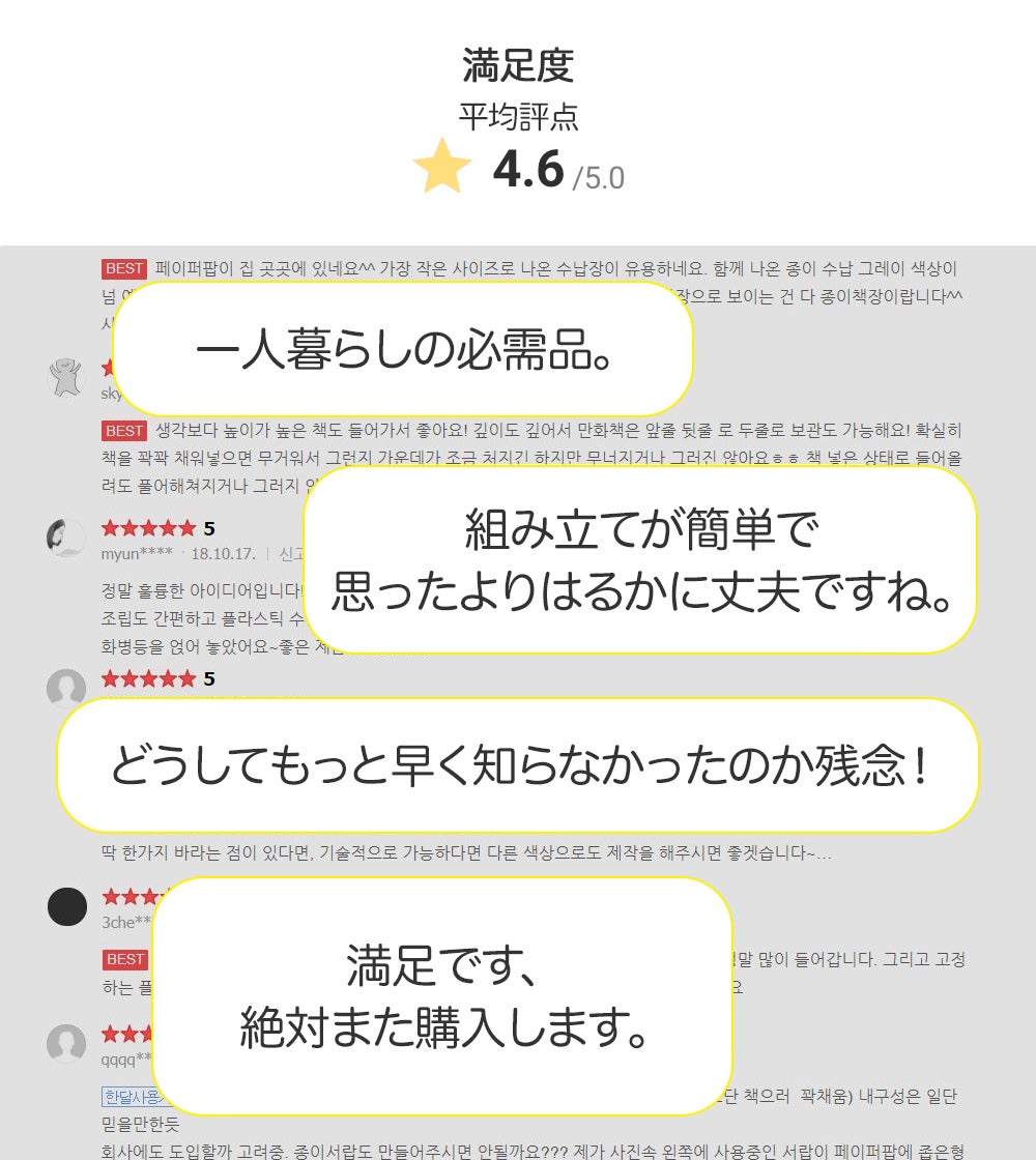 累積レビュー数1万件以上、平均評価4.6点と多くの方々からペーパーポップの好意的なレビューをいただきました。(自社モール基準)
