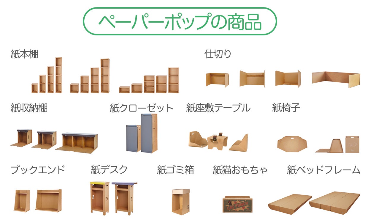 ペーパーポップの紙家具は移動の負担なく宅配便で配送できる紙家具、リーズナブルな価格帯の紙家具の提供を目指しています。