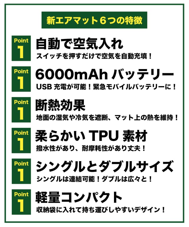 「新エアマット」は、キャンプや昼寝、災害が発生した時の必須アイテムとして大活躍する、自動エアポンプと6000mAhバッテリーを内蔵した持ち運びし易いマットです!