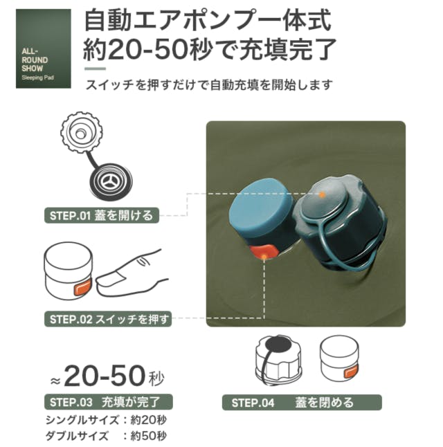 A1:ボタンを押すだけで約20(シングル)-50(ダブル)秒で空気入れができます。但し、内蔵のエアポンプでは不十分な場合、別途エアポンプをご用意いただき、満タンまで空気を入れることもできます。特にダブルサイズは空気の容量が大きいため、別途エアポンプの使用をお勧めします。