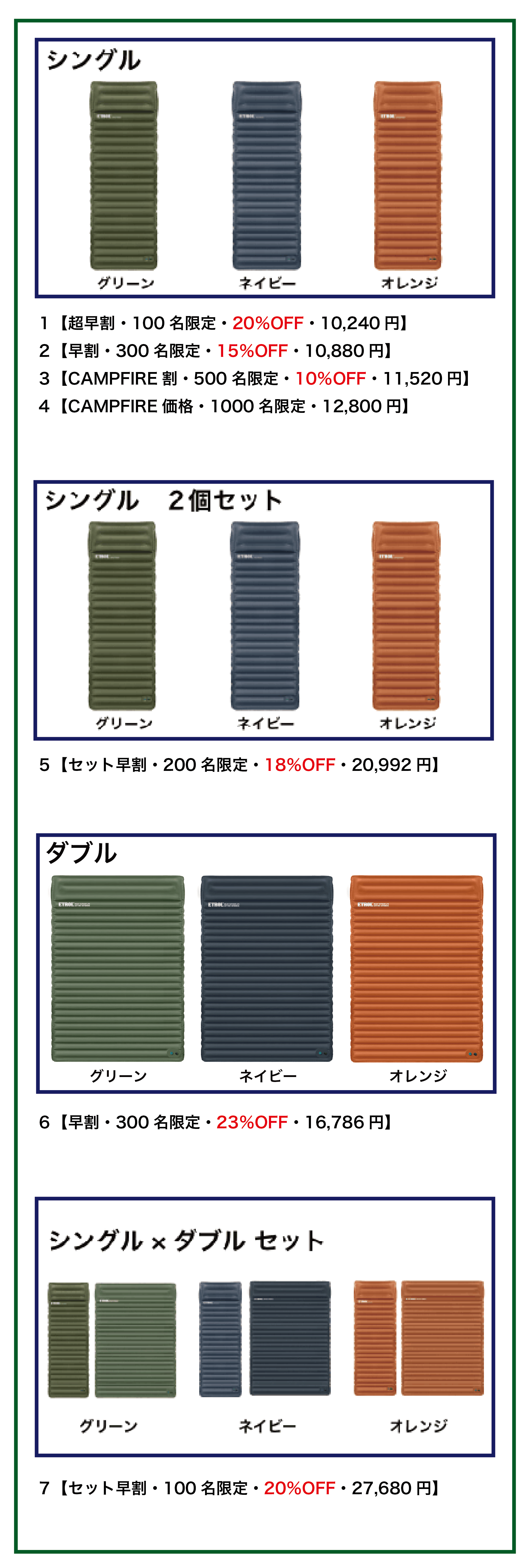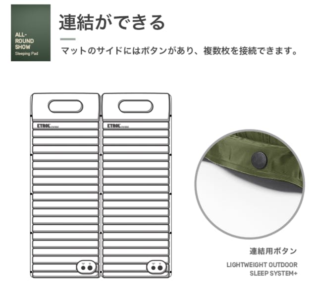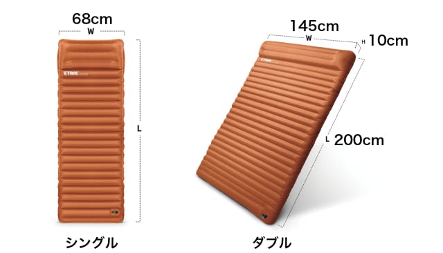 サイズはシングルとダブルから選ぶことができ、空気を抜いて収納をすると、持ち運びし易いコンパクトサイズになります。ダブルサイズはもちろん、シングルサイズも連結することで、広々とカップルや家族で楽しむことができるので、アウトドアグッズとしてオススメです!前作からバーションアップして登場です!