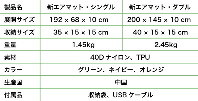 内蔵のエアポンプでは不十分な場合、別途エアポンプをご用意いただき、満タンまで空気を入れることもできます。特にダブルサイズは空気の容量が大きいため、別途エアポンプの使用をお勧めします。