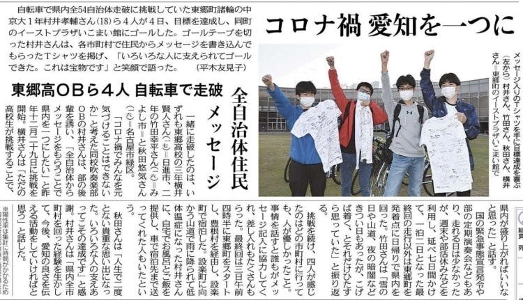今回のプロジェクトの高校1年生以外のメンバーで昨年年末から挑戦が始まった企画があります。僕達は愛知県に住んでいて、地元がとても大好きです。そして、どうにか「コロナ禍の愛知県を一つにすることはできないか」と考えて「自転車で愛知県の全市町村を回り、Tシャツにメッセージを書いてもらうことで愛知県を一つにしよう!」と思い挑戦をスタートしました。詳しくは、取材していただいた中日新聞さんの記事を見ていただきたいです。
