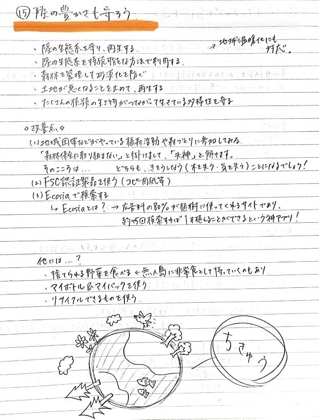 僕は⑮『陸の豊かさも守ろう』も調べました。陸の生態系を守ること、森林を増やすこと、土地を再生ことなどが主な内容となっています。これは地球温暖化と深く関係を持っており、達成することにより地球温暖化の改善にも繋がります。