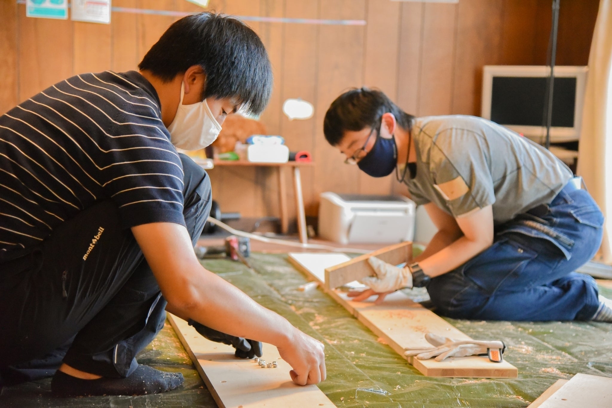 木材の採寸→カット→組み立てと役割分担をして作業しつつも、