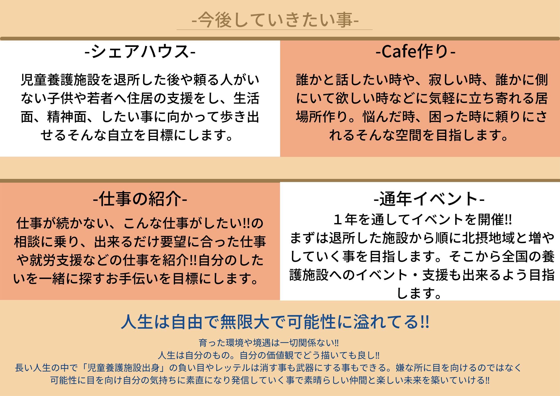 その中で、諦めがちな夢やしたい事を同時に応援し、退所した後の長い人生をしっかり見つめて欲しいと願います。18歳で世の中に出て、家族に頼れないからこそ、施設にいる間にしっかり自分の人生と向き合い、出た後もしっかり仲間と生きていけるようなシステムが、必要だと感じました。