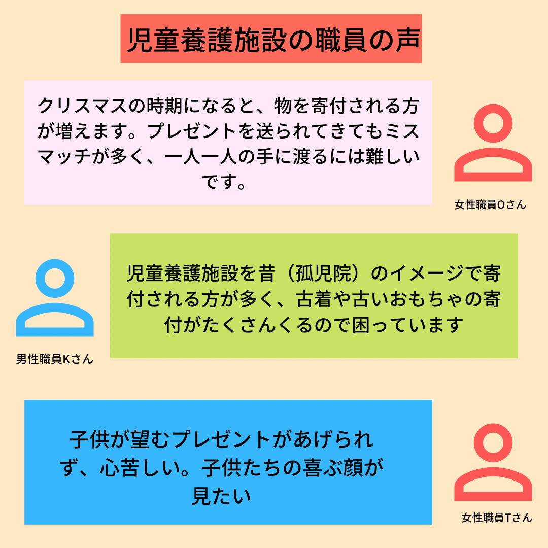 施設に入り、家族と離れて寂しい思いをしている子供たちが多い中、子供たちが望むことを一つでも叶えてあげたい。子供たちにとって寂しいクリスマスではなく