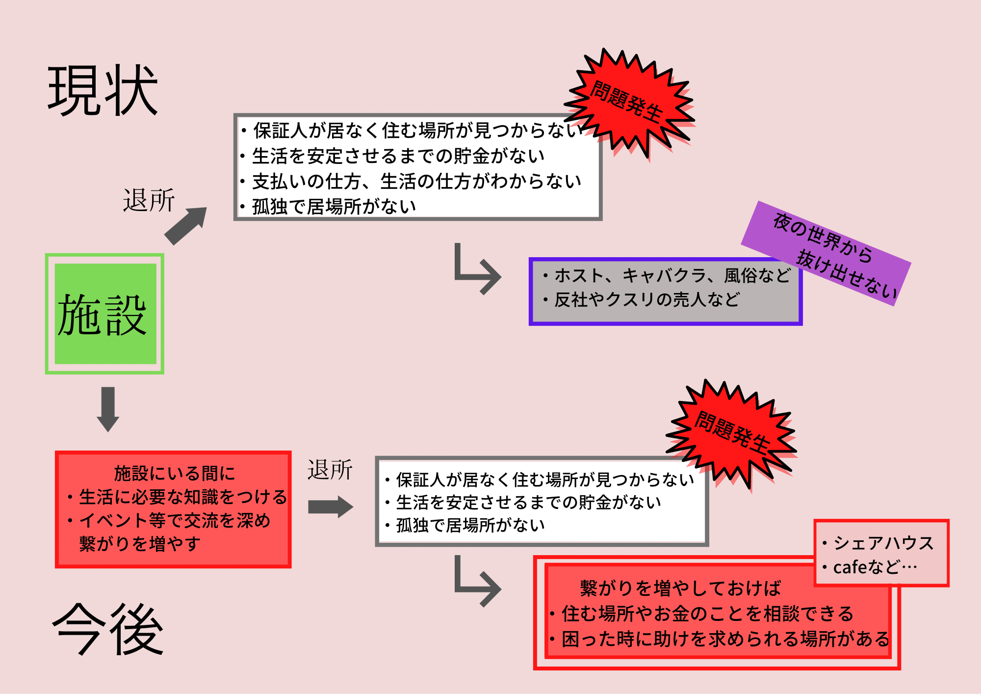 そんな子供たちを、減らす為に養護施設の時から交流を持ち職員や同級生とは違う関係を築き、退所した後の現実を教え、助けになるシステムを作りたいと考えます。