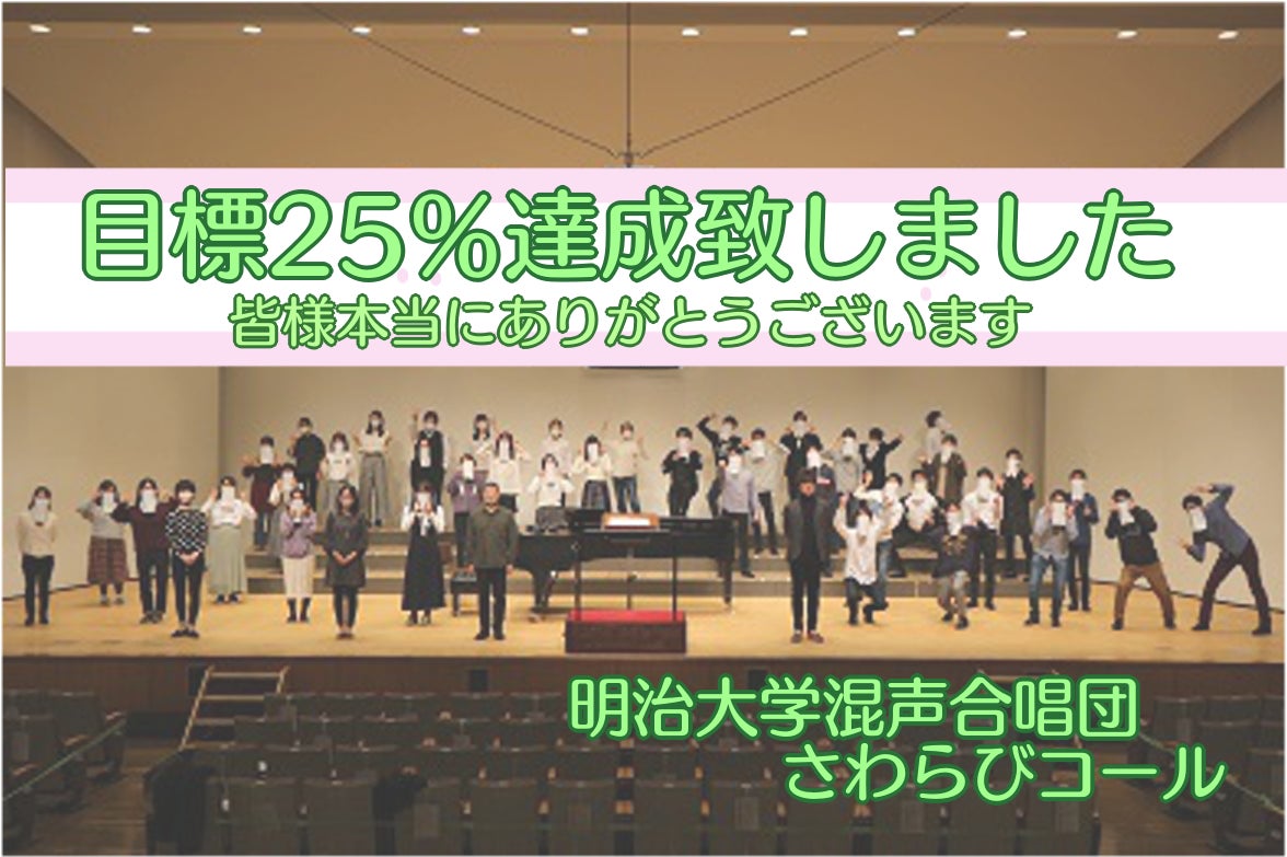 こんにちは、明治大学公認混声合唱団さわらびコールです。今回初めて行ったクラウドファンディングについてでありますが、昨日にプロジェクトが終了いたしました。結果847,440円、総じて54名の方にご支援いただきました。ご協力いただいた皆様に心より御礼申し上げます。このプロジェクトを通じ、我々が本当に多くの人々の想いを受け継いでいること、そしてこれほど多くの方の応援のもと成り立っていることを改めて実感いたしました。コロナウイルスによって合唱界隈はかなり逆風の中におりますが、皆様の応援を力に、これからも良い歌を届け・歌い・繋いでいきたく存じます。改めて、今回多くのご支援をいただき本当にありがとうございます。明治大学公認混声合唱団さわらびコール一同
