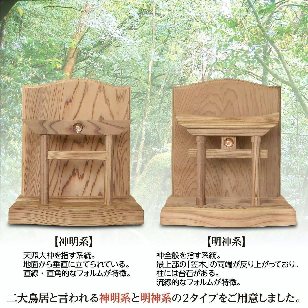 「明神系」笠木(かさぎ)」と「島木(しまぎ)」から成る二層構造で、笠木の端が反っている形を取っています。神全般を指す系統でたて柱に台石があり、中央の「額束・がくつか」に本水晶を配しました。