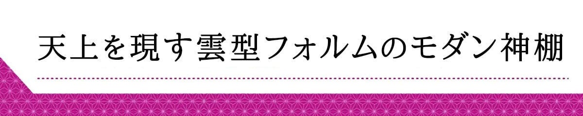 新デザインの「雲型」の由来をご存知ですか!?神棚の上の天井に雲という筆文字や木をくり抜いたものを貼ったり、雲板という雲のデザインを神棚の棚板に設置したりする風習です。これは昔の平屋建てと違い、現代の住環境では一戸建てでも二階、三階、マンションなどの集合住宅では上に別の住人が住んでおります。この場合「神様の上に人が立つ」という事になり失礼にあたる!そういった事から神様の上に雲を設置する事で、神様の上には雲だけ、天しかないという意味合いがあります。今回、雲型デザインの神棚はその意味では「神様は雲の上におられるので」最大の敬意を表した作品となります。