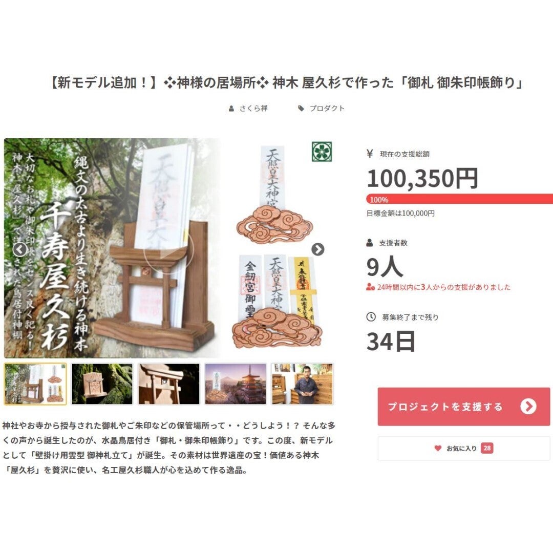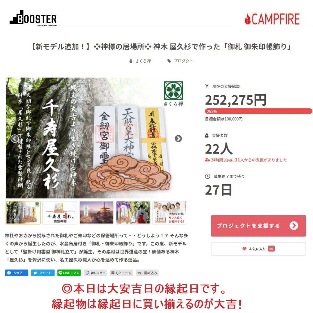 【新モデル追加!】❖神様の居場所❖ 神木 屋久杉で作った「御札 御朱印帳飾り」プロジェクトのさくら禅事務局です。この度【CAMPFIRE】さんの「新着プロジェクト」にて!本プロジェクトが紹介されました。◉本日は金運「虎の日」の縁起日。縁起日に縁起物を買い揃えるのは大吉です。 一人でも多くの皆さまに神木「屋久杉」の素晴らしさを広める為、更なる情報拡散のご協力を賜りますと幸いでございます。<(_ _)>★プロジェクトページ下の【 fシェア】【ツイート】【LINEで送る】のボタンからのご紹介。又は、下記のURLを【 LINE・ツイッター・Facebook・インスタグラム・YouTube 】等でひつでもシェア拡散をいただければ大変ありがたいです。https://camp-fire.jp/projects/view/471787何卒、宜しくお願い致します。
