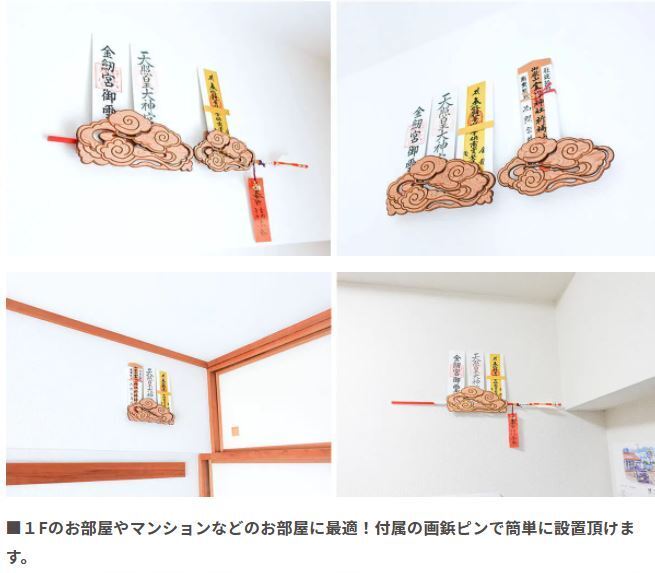 神木屋久杉「御札 御朱印帳」飾りプロジェクトをご覧頂き誠に有難うございます。お客様より、お問い合わせを頂きましたので、新作の壁掛け用「雲型」タイプの設置方法を今一度、お知らせ致します。★壁掛け用「雲型」タイプは軽量で「御札」のお祀り専用となっております。お取り付けは雲型タイプの後ろ側に取り付け板があり、2か所の穴が開いております。そちらに付属の画鋲ピンをさして簡単に取り付けて頂く仕様となります。(例と致しましてはポスターを壁に画鋲でとめて飾るような感じです)どなたでも簡単に御札をお祀り頂ける壁掛け用「雲型」タイプ神木屋久杉の太古の年輪の美しさと香りをお楽しみ下さい。