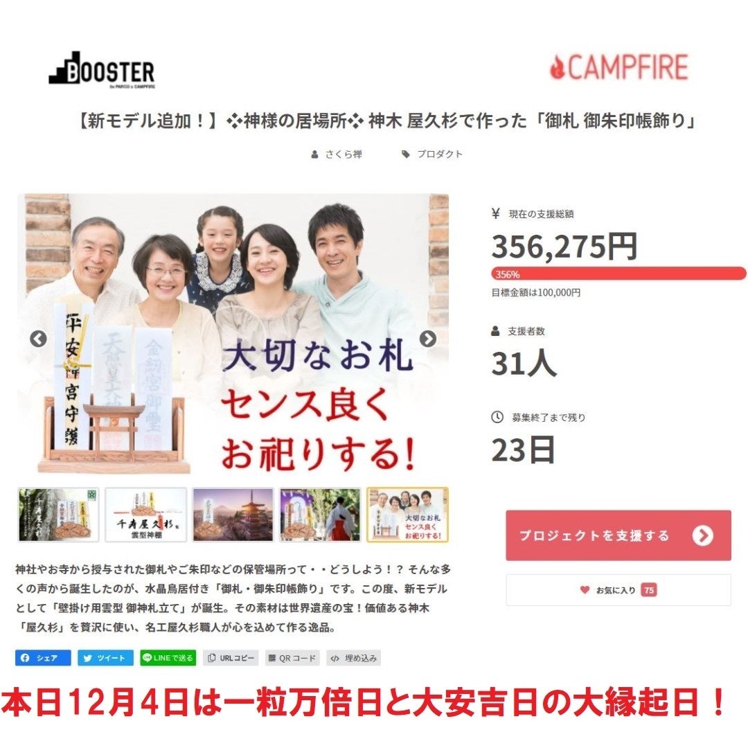 どうも❖神様の居場所「神木屋久杉 モダン神棚」プロジェクトのさくら禅です。◉本日は12月4日(土)は一粒万倍日と大安吉日が重なる大縁起日。縁起物は縁起日に買い揃えるが大吉です。★光り輝く新たな年を祈念し、御参拝、初詣のご準備はお済ですか!?今なら数量限定!超早割25%OFF!さらに特製開運根付の特典付きです。◆BOOSTER×CAMPFIRE 神様の居場所!神木屋久杉「御札・御朱印帳飾り」https://camp-fire.jp/projects/view/471787プロジェクトの進捗や状況につきましては「活動報告」にて適宜、投稿させて頂きます。一人でも多くの皆さま方に屋久杉の素晴らしさを広める為、ご支援者様には更なるご協力を賜りますと幸いでございます。★プロジェクトページ下の【 fシェア】【ツイート】【LINEで送る】のボタンからのご紹介。又は、下記のリンクを【 LINE・ツイッター・Facebook・インスタグラム・YouTube・ブログ 】等で…1つでもシェアをいただければ大変ありがたいです。https://camp-fire.jp/projects/view/471787何卒、宜しくお願い致します。●さくら禅公式:https://lit.link/sakurazen