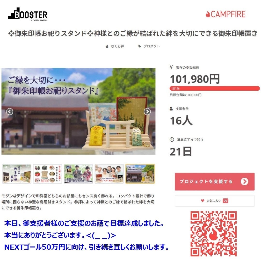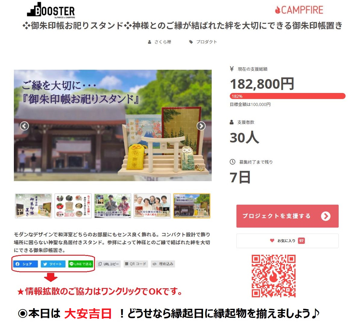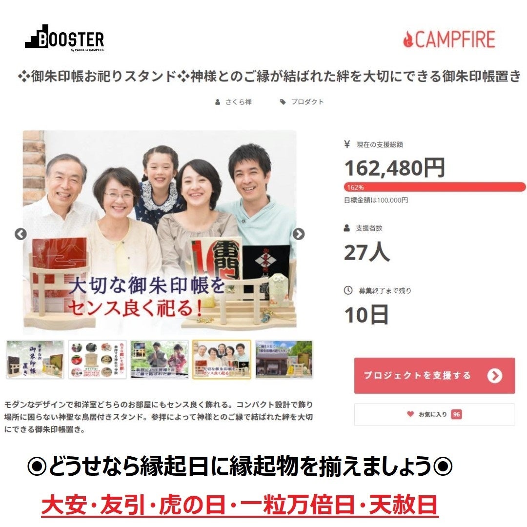 本日は金運虎の日です。縁起日に縁起物は揃えれば大吉です。また、プロジェクト企画も残りわずか2日となりました。。是非この機会に先行販売価格でお求め下さい。秋の行楽シーズンに行く御朱印巡りや年末年始のご参拝で神様とのご縁を頂いた御朱印を御朱印帳に拝受し!家のお気に入りの場所にセンス良く御札や御朱印帳をお祀り頂けます。★引き続き、SNSなどでのご紹介・拡散のご協力をお願い出来れば幸いです。宜しくお願い致します。<(_ _)>●~*CAMPFIRE・BOOSTERのプロジェクトは↓https://camp-fire.jp/projects/view/471788