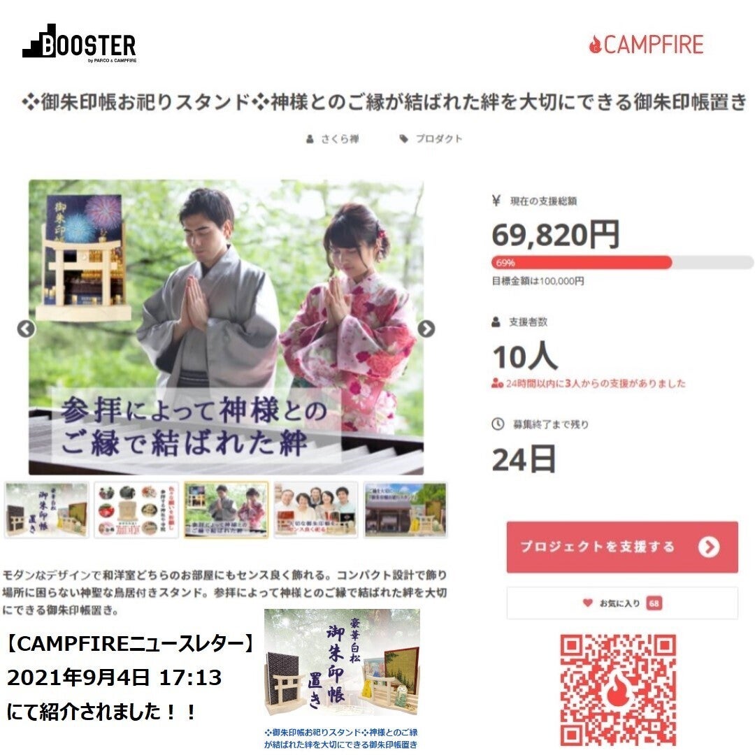 ❖御朱印帳お祀りスタンド❖神様とのご縁が結ばれた絆を大切にできる御朱印帳置きプロジェクトのさくら禅です。昨日の【CAMPFIRE・ニュースレター】で当プロジェクトが紹介されました。【お気に入り】に入れて頂いている方も少しずつ増えてきているようで、目標金額達成まで、あと少しとなりました。本日は大安吉日です。縁起の良い日に縁起物のお買い物は大吉です。★ご支援者様のお力添えで、こちらもSNSなどでの拡散のご協力を頂ければ幸いです。https://camp-fire.jp/projects/view/471788何卒、宜しくお願い致します。