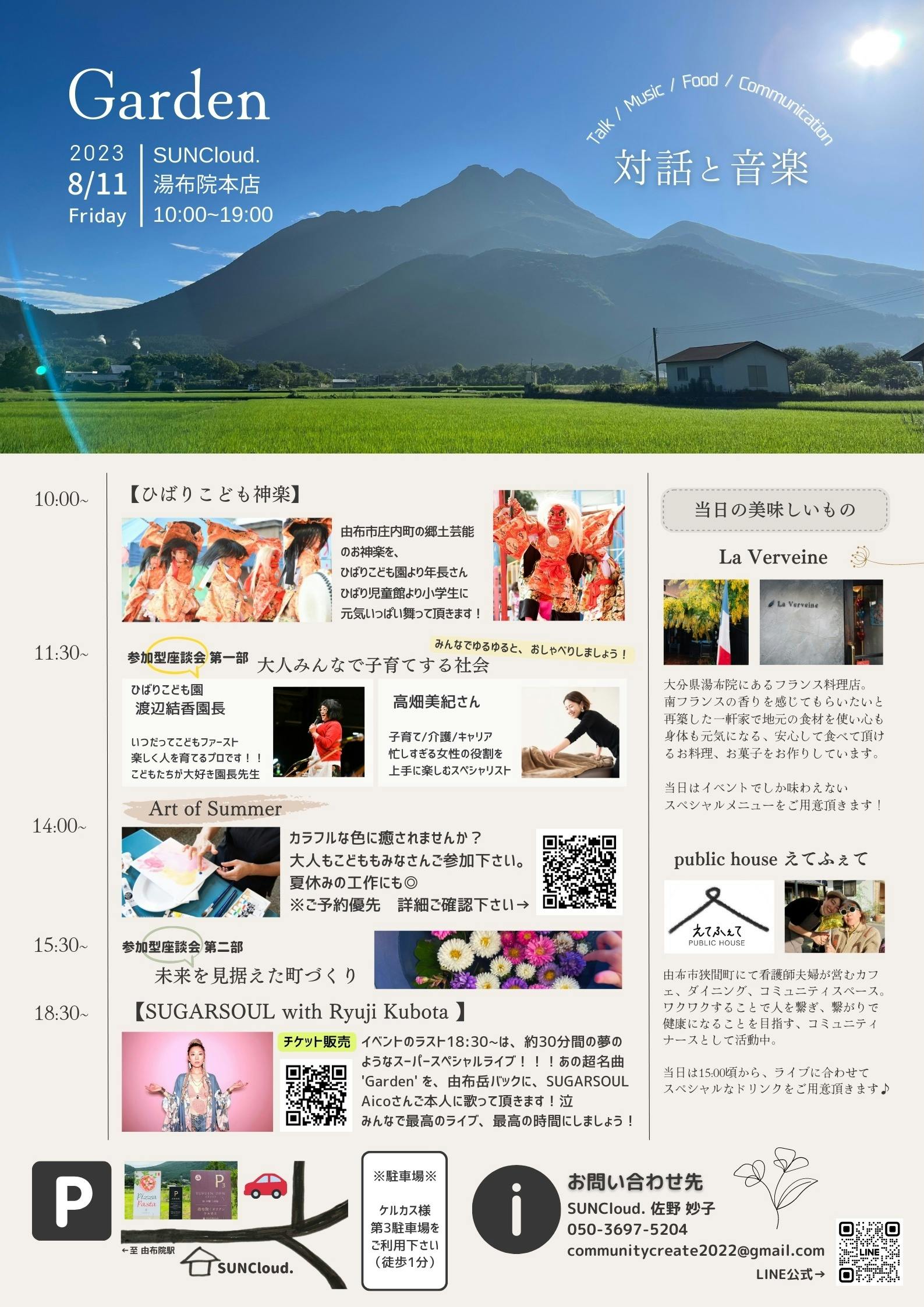 2023/07/07 22:05湯布院は梅雨ももうすぐ終わりが見えている今日この頃。皆様いかがお過ごしでしょうか?皆様にご支援頂き、SUNCloud. 湯布院店の中庭ができてから1年半という月日が流れようとしています。長引くコロナの影響により、これと言って人が集うような機会を作れずに来ましたがこの夏こそ、という思いで春先から準備して来た企画になります。イベントのタイトルは【Garden】1999年に大流行した名曲、Gardenを、当店の中庭で、由布岳バックに、、、歌って頂きます!!!チケット販売ページぜひお近くの方はこれを機に、中庭にいらして頂けると嬉しいです!遠方の皆様にも、当日の様子をこちらで報告させて頂きますので引き続きよろしくお願い致します!!佐野 孝男・妙子 もっと見る