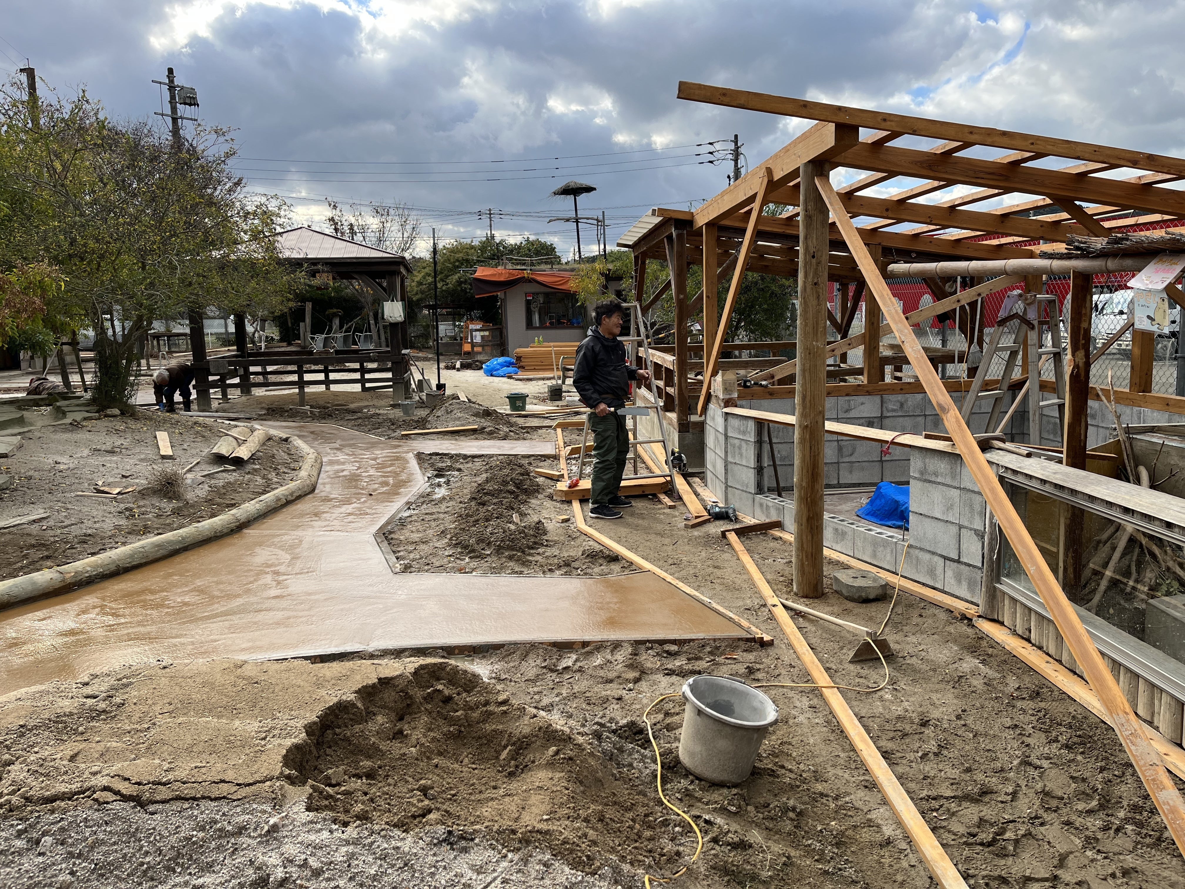 昨日の工事進捗をお伝えします。朝から昼までにコンクリート6㎥打設し、ビーバー舎屋根の骨組みまで完了しております。職人さん4名と頑張っておりますが、職人さんにも疲れの色が見えてまいりました。本日は4日目となりますが、ヘルプの職人さんが長崎から来てくれることになっております。