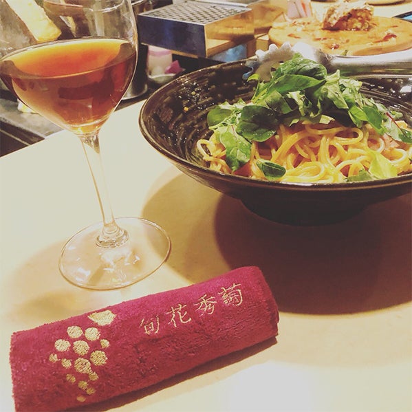 『梅田ワインバー旬花秀萄』様。お料理やドリンクに合わせたおしぼりを提案しています