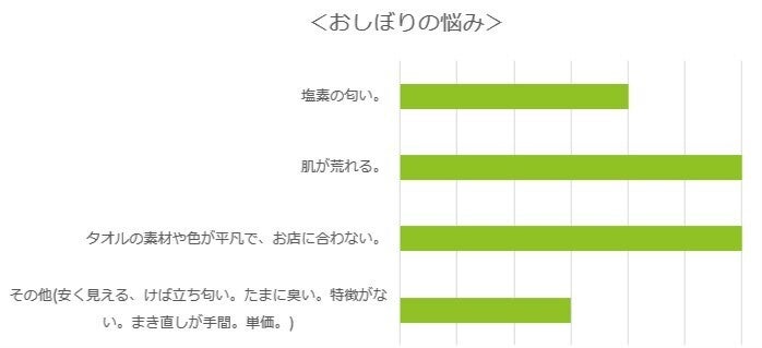 おしぼりは、来店すると始めに出てくるお店の顔なのに、白色・無地・ほぼ同じ大きさ・ほぼ同じ厚みなど、おしゃれ感も繊細さも面白みもありません。(下記、2021年3月開催の食王でのアンケート調査「お店のおしぼりの悩み」参照)