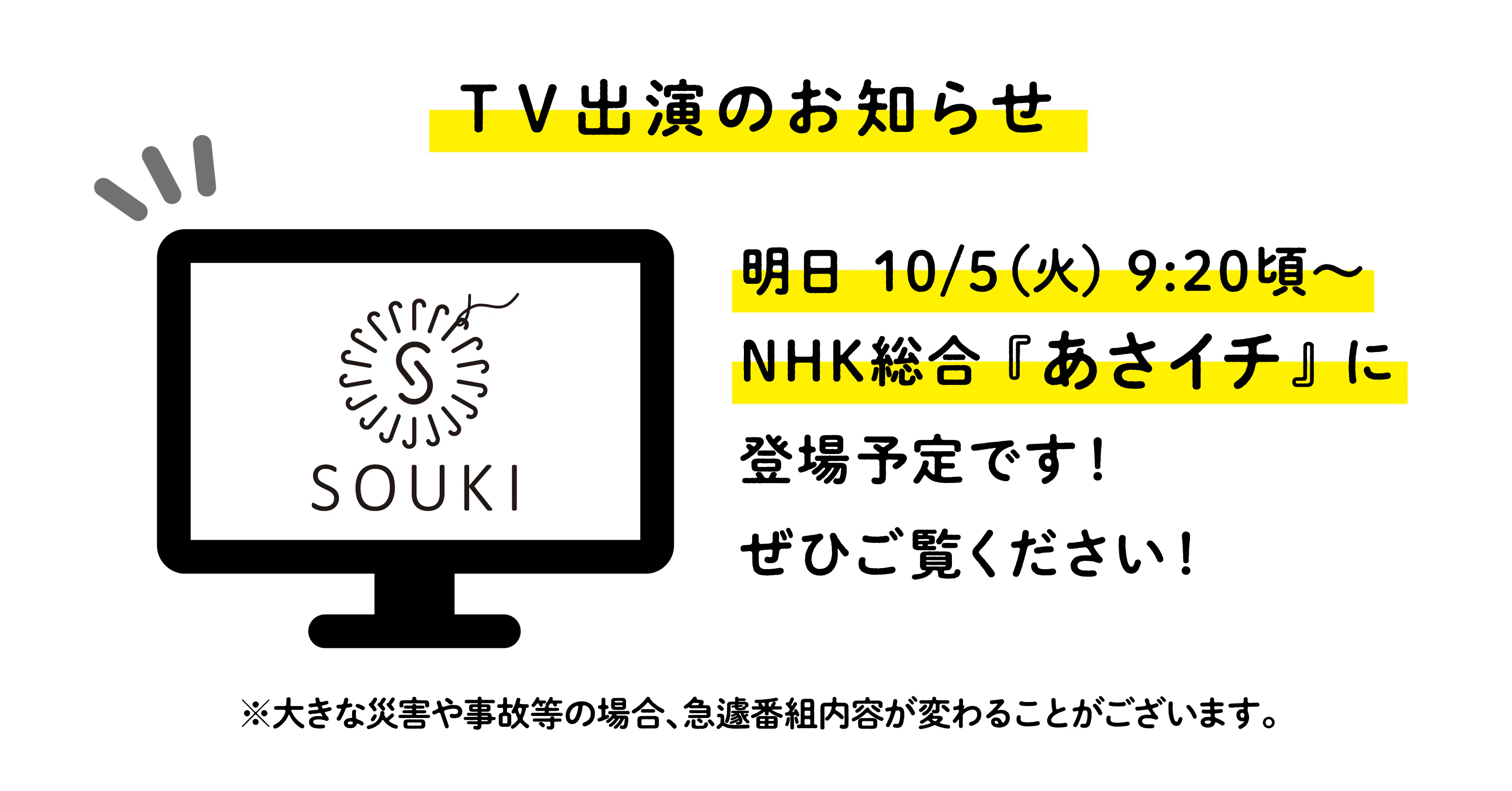 10月5日(火)8:15〜NHK総合にて放送予定の『あさイチ』にSOUKIが出演予定です。