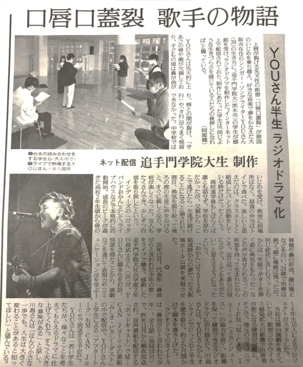そんな暖かい彼の姿には「※口唇口蓋裂」という先天性異常や「在日コリアン」という血を持って生まれた背景がありました。この作品では、YOUさんが生まれた時の家族の反応から、クラスの人気者だった幼少期、ひどくからかわれることの多かった学生時代まで包み隠すことなく演じ、そういった困難を乗り越えて夢を叶えていく姿を演じます。