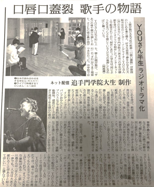 特に今回の公演では、「口唇口蓋裂」という障がいと「在日コリアン」の血を持つシンガーソングライターのYOUさんが多くの困難にぶつかりながらも、夢を追い続けている姿を舞台化することで、ラジオドラマでは出せなかった表現を加え、耳だけでなく目やその場に漂う空気をも身近に感じて頂けると思います。