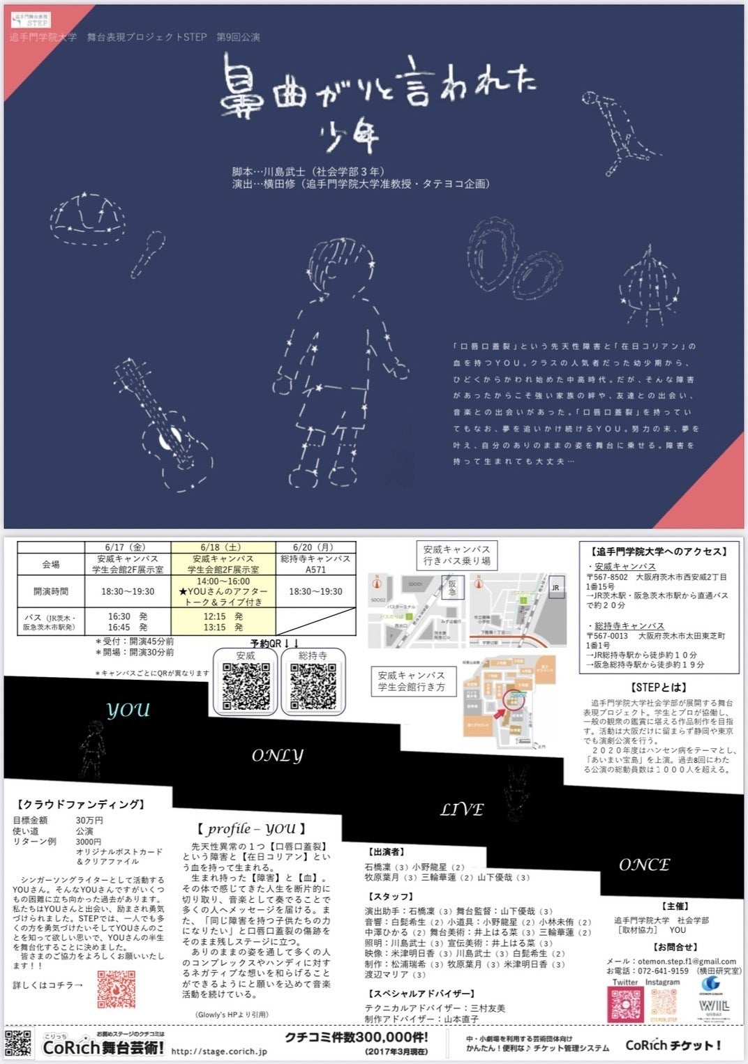 「口唇口蓋裂」を持って生まれたYOUさんのこれまでの軌跡を描いた作品を上演することで、「口唇口蓋裂」という障害を知ってもらうとともに、そういった背景に負けることなく、自分の夢や信念を追いかける勇気や希望を与えたい、そして多くの方の心に本作品に込められた思いを届けたいと思っています。