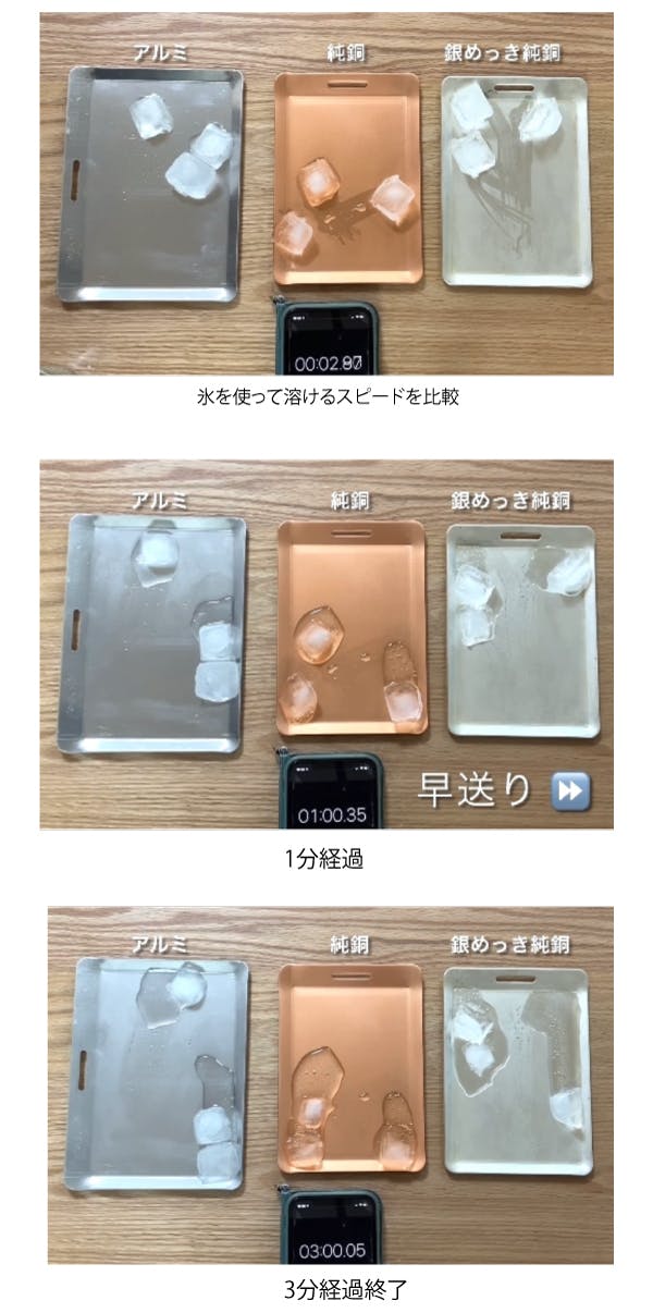 それに比べ純銅製プレートと銀めっき純銅製プレートの方はみるみるうちに溶けていくのが分かります。