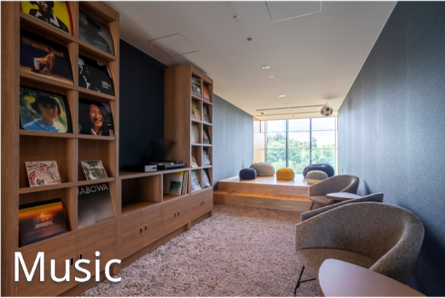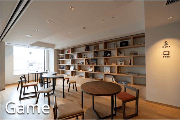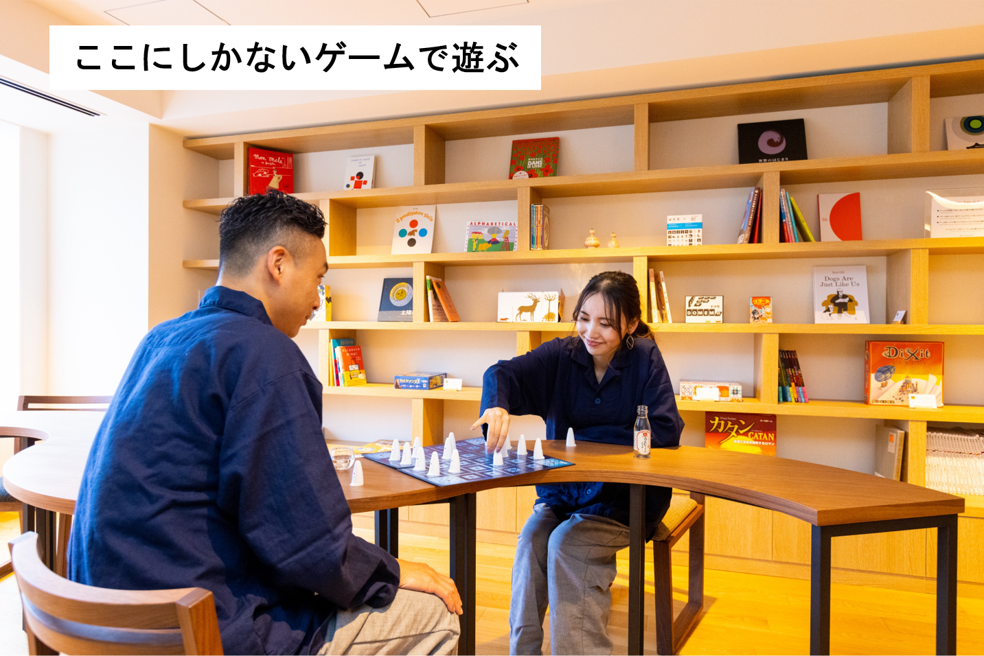 「あわいの間」には本やレコード、ボードゲームといったテーマごとの空間をご用意しております。気になる本を探してみるもよし、音楽に聴き入るもよし、出会った人とゲームで打ち解けるもよしの空間。お部屋から飛び出して探検してみませんか。