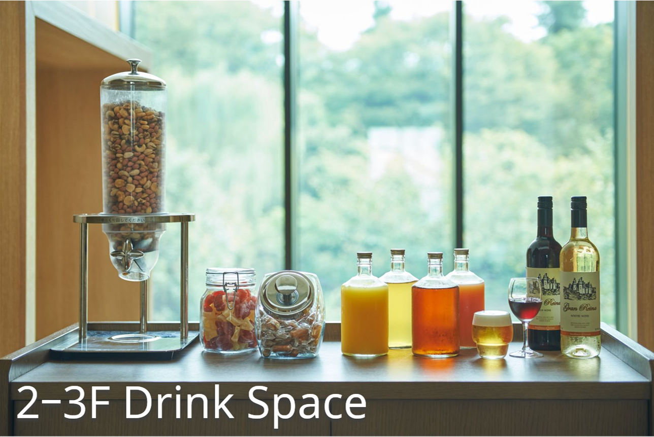 ビールやワインなどのアルコール、上質な茶葉で水出ししたアイスティや100%ジュースなどのソフトドリンクとそれに合わせたスナックをご用意。フリースペース・セルフサービスのドリンクスペース。