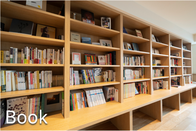 壁一面の本棚には、京都で本屋「誠光社」を営む、ブックソムリエの堀部篤史さんがセレクトした多種多様なジャンルの本たちが並びます。普段は手に取らない本との出逢い、時間を忘れるくらい夢中になる本との過ごしをお楽しみください。