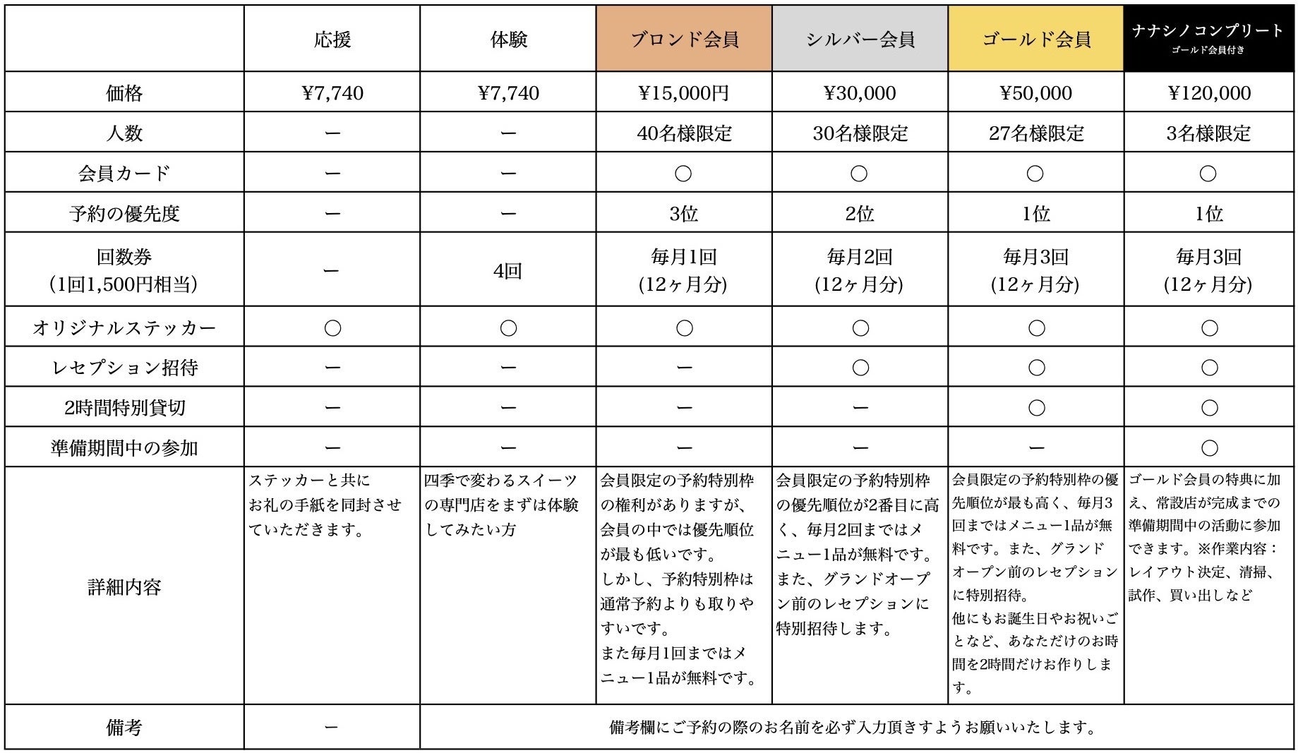 ゴールド会員に加え、常設店ができるまでの準備に参加でき、ナナシノ完成までの全てを知ることができます。