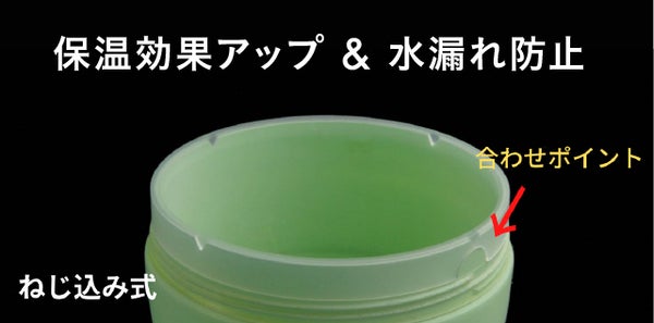 保温効果のひみつの一つは、内側のインナーカップの折り返しがボディを覆うように設計され、シリコンカップとボディのマークが合わさってストッパーになり、ねじ込み式のフタをきっちり閉めることで保温効果のアップと、水漏れ防止になっています。