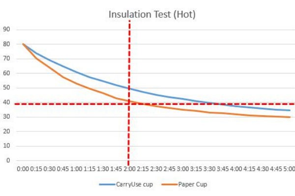 熱い約80℃のお湯をカップに注いで1時間程経った時点でも、Carryuse cupの中の温度は約60℃。