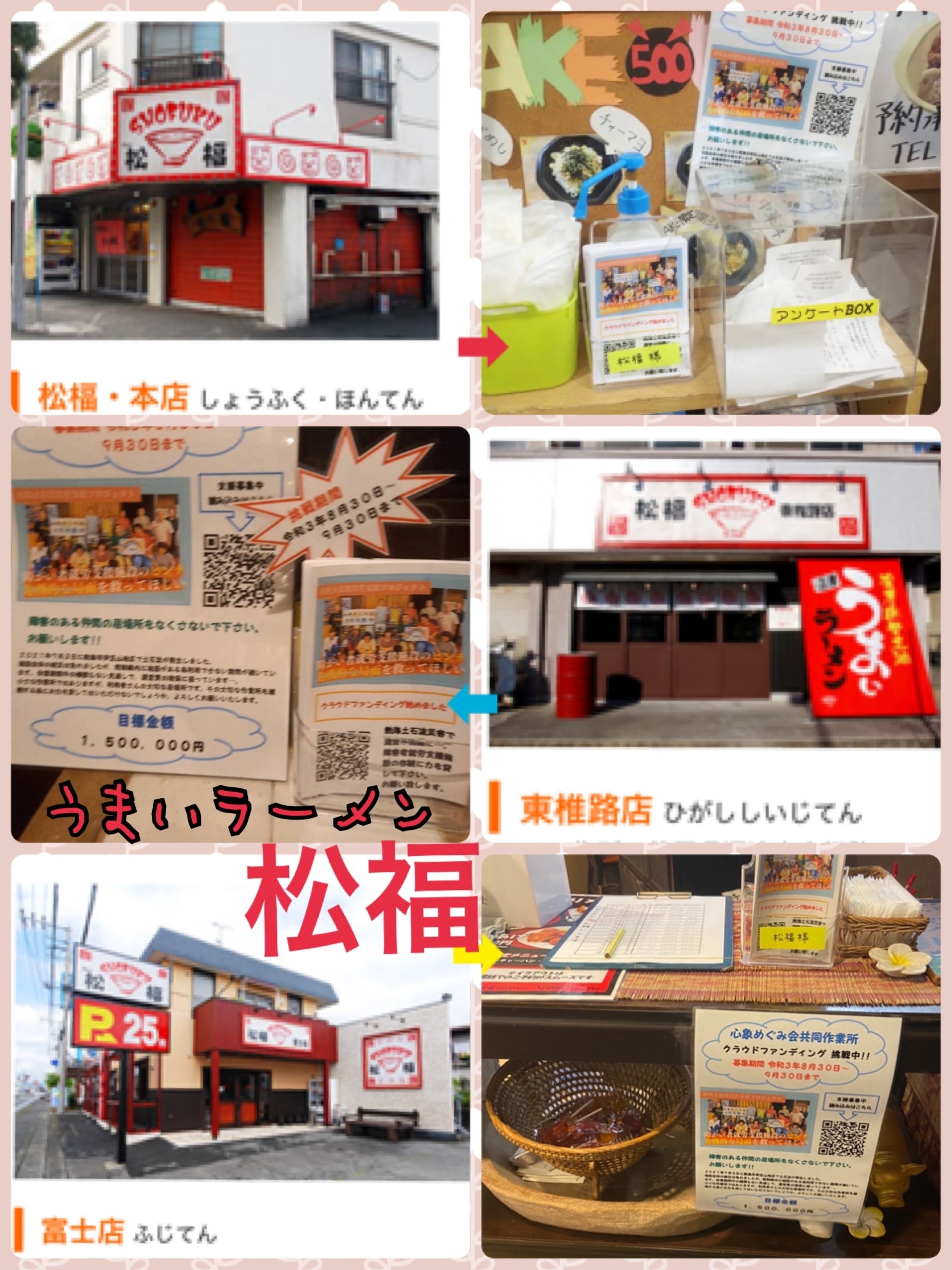 うまいラーメン「松福」 http://www.shofuku.jp/ 超有名店のこちらのご夫婦は熱海出身!クラウドファンディングの連絡を入れさせて頂いたところ、すぐに「何すれば良い?」とお返事 お言葉に甘えて7店舗に卓上チラシを置いて頂いております。松福さんは災害直後の避難所にチャーハンやお弁当を差し入れ支援をされていました。