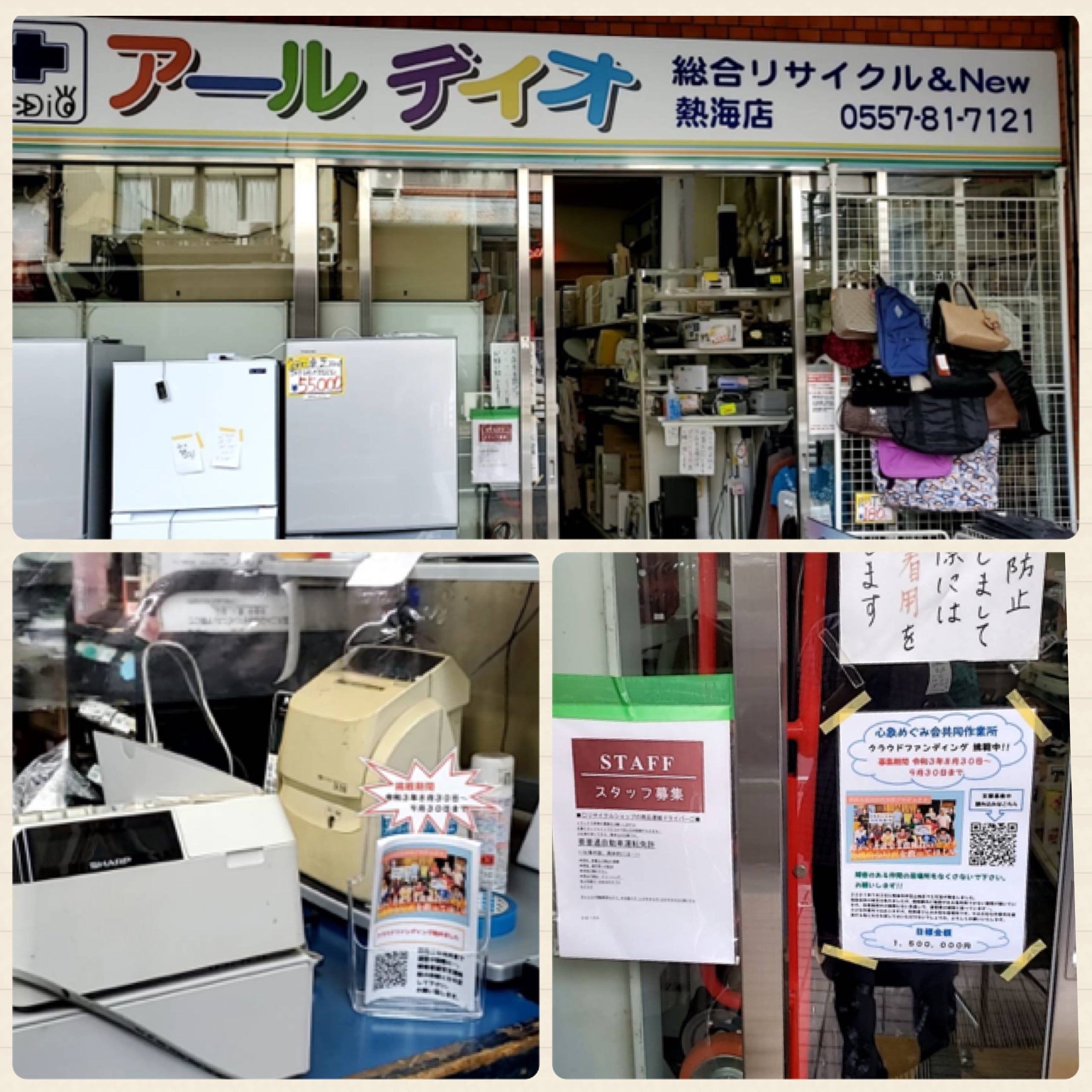 熱海市清水町のバス通りにあるリサイクルショップの「アールディオ」さんの店内入口に広告を掲示して頂き、店内レジ横に沢山チラシを置いて頂いております。