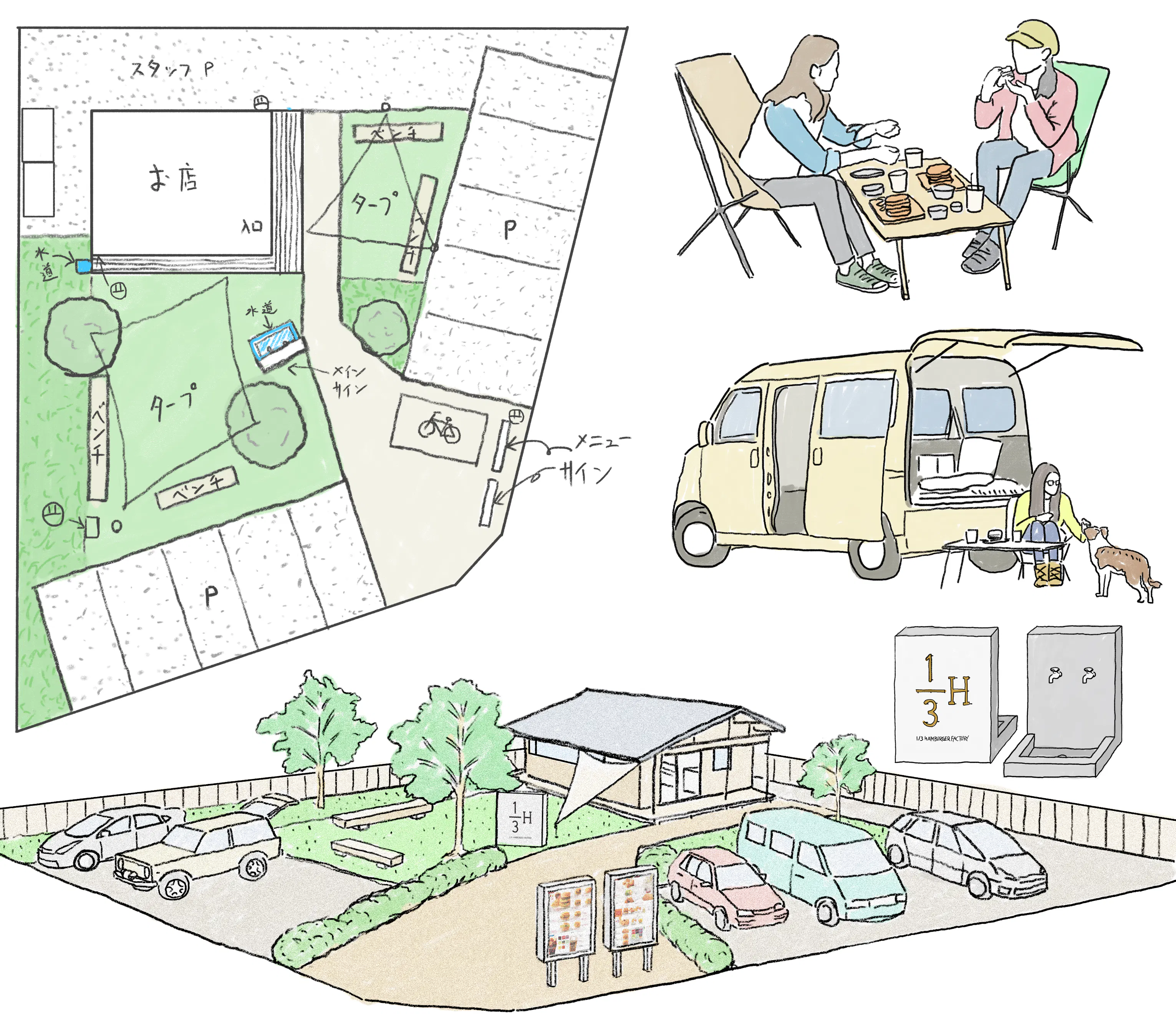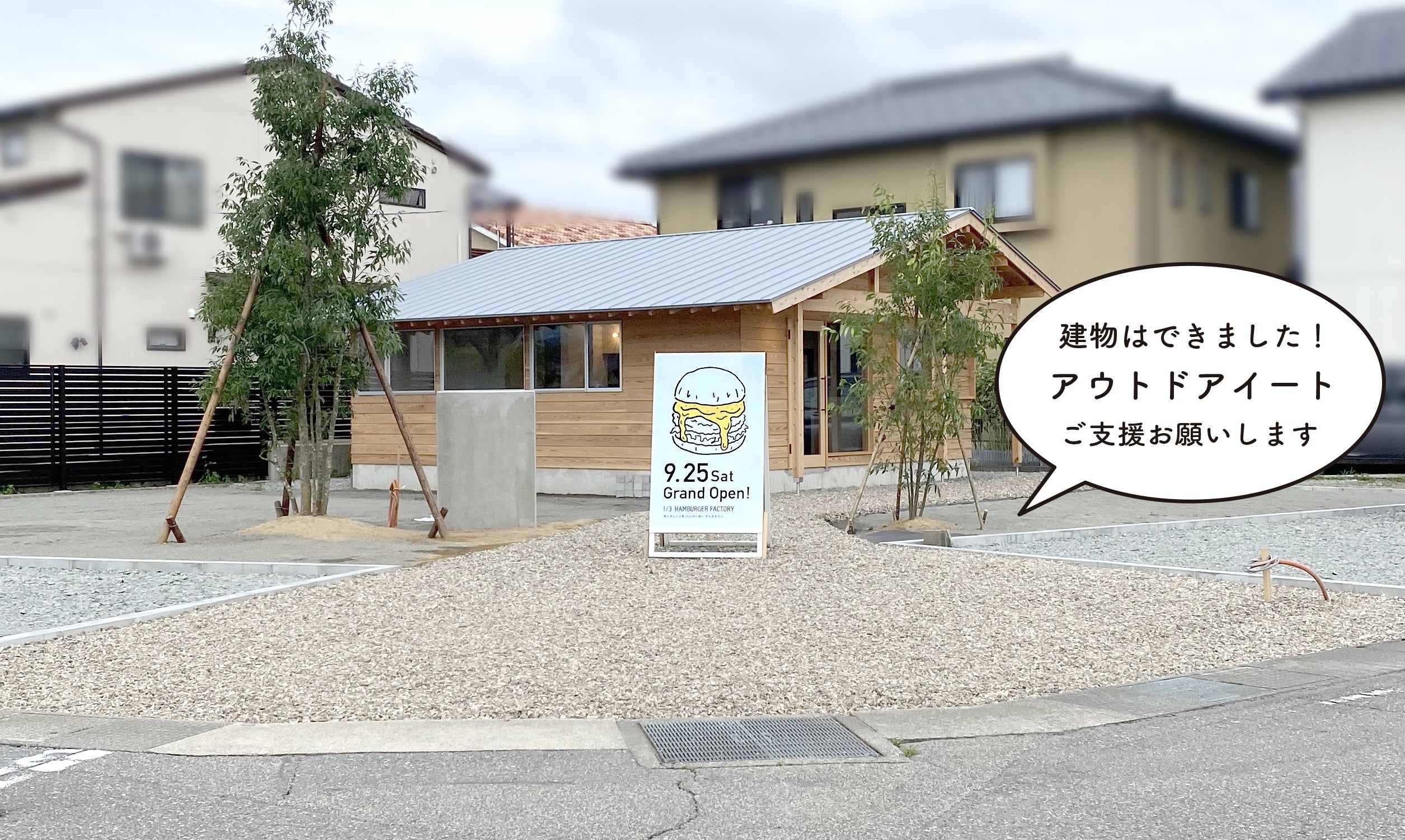 新型コロナウイルス感染予防対策として、お店の外でもハンバーガーを楽しんでいただけるような店舗設計にしています。みなさまから頂いた支援金は、公園に遊びに来たようなアウトドア・イートスペースをつくるための緑化整備に使わせていただきます。