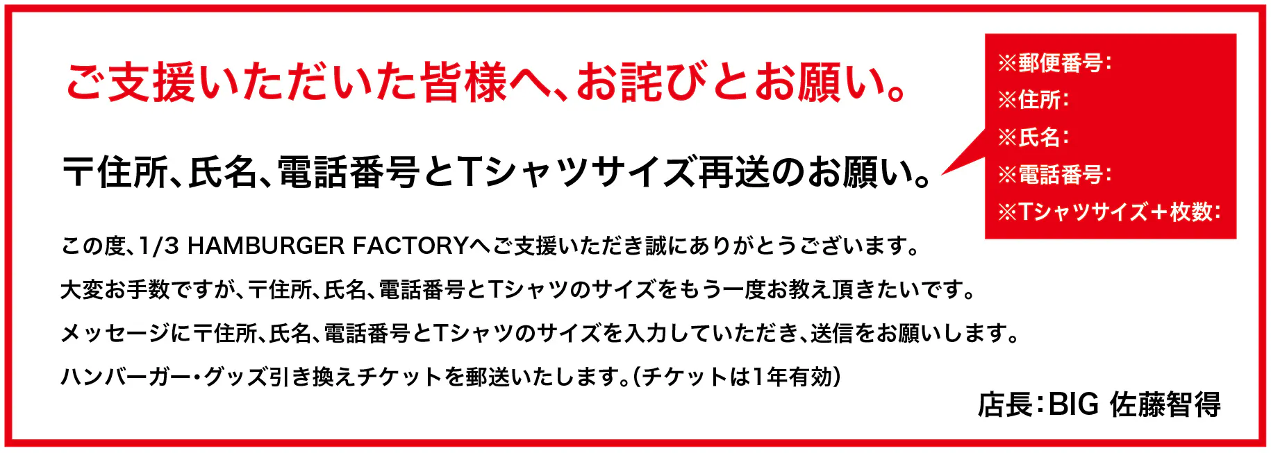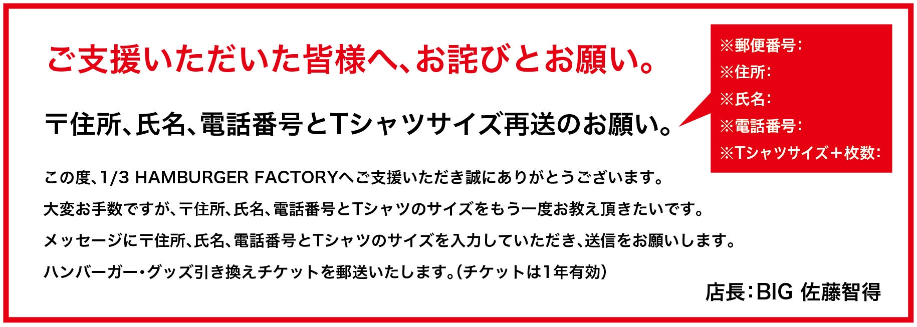 ・受け渡し方法:ハンバーガー・Tシャツチケットを事前に郵送いたします。