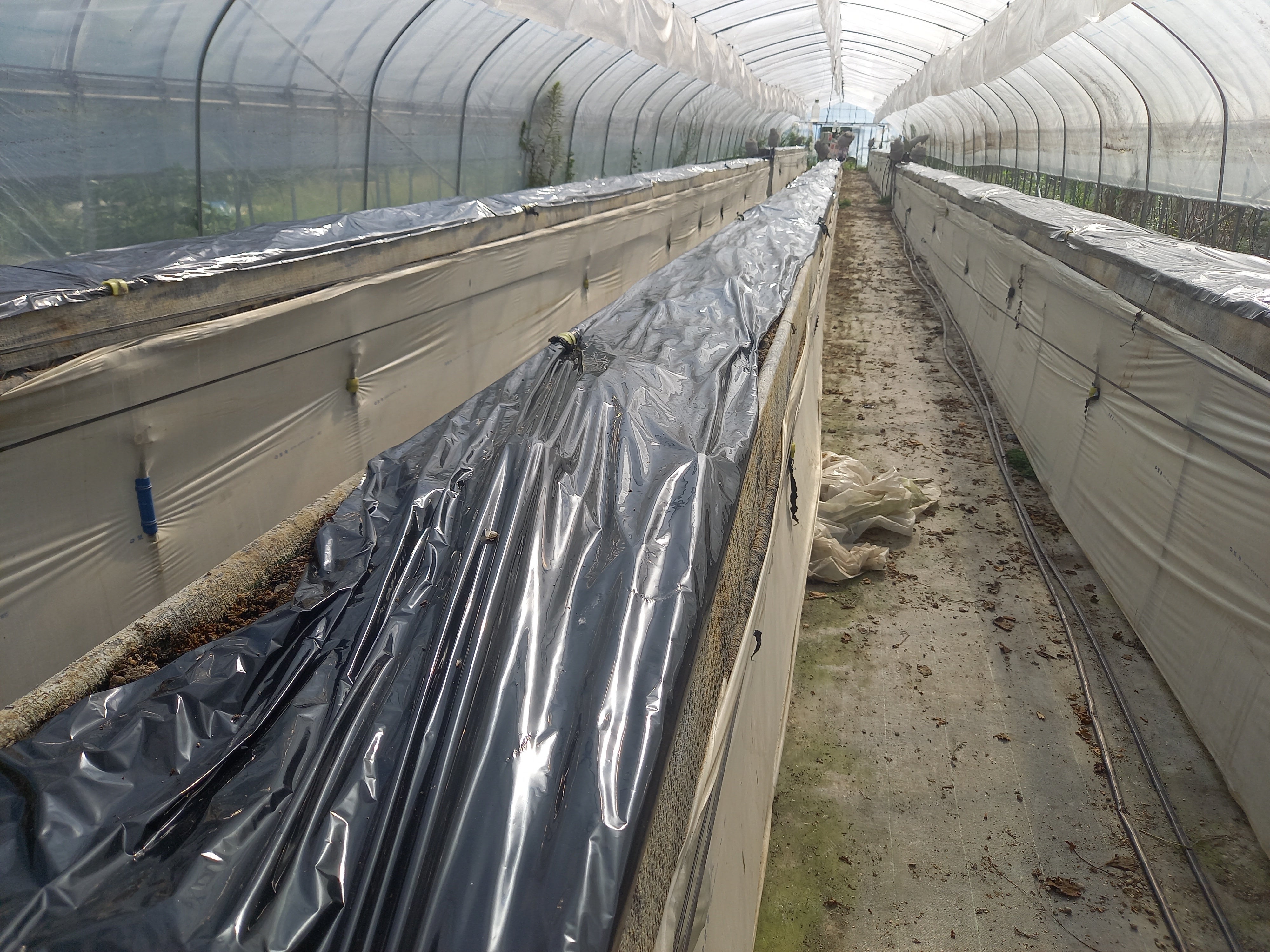 ビニール(マルチ)をかけて太陽の熱で消毒をする。