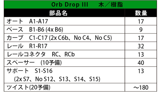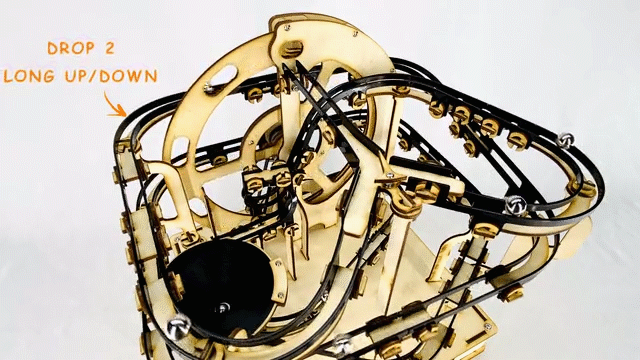 木・樹脂・金属の複合設計で作成されており、クロム鋼でできたビー玉が電動モーターで動く大きなホイールリフトによって運ばれ、ランコースを走行します。