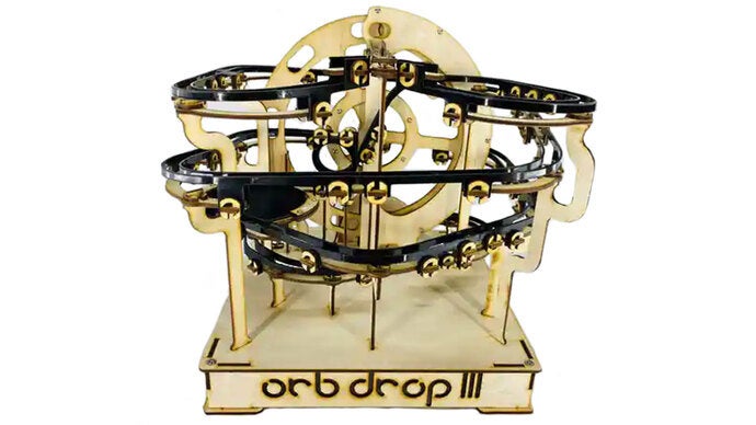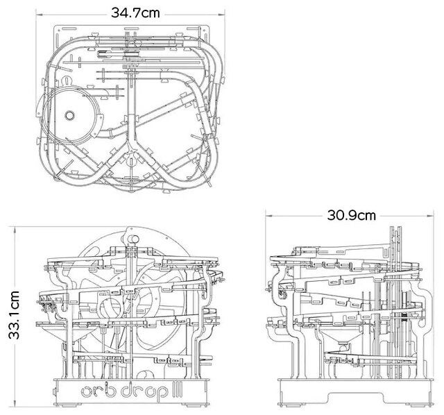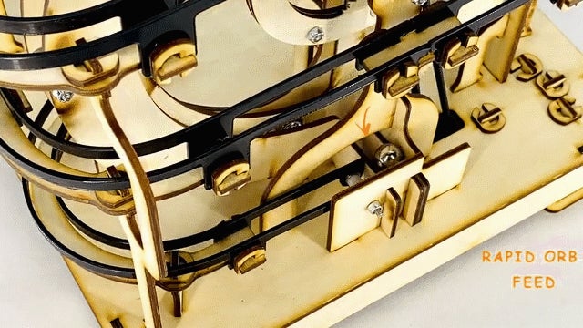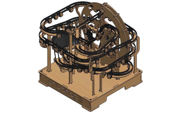 木・樹脂・金属の複合設計で作成されており、クロム鋼でできたビー玉が電動モーターで動く大きなホイールリフトによって運ばれ、ランコースを走行します。