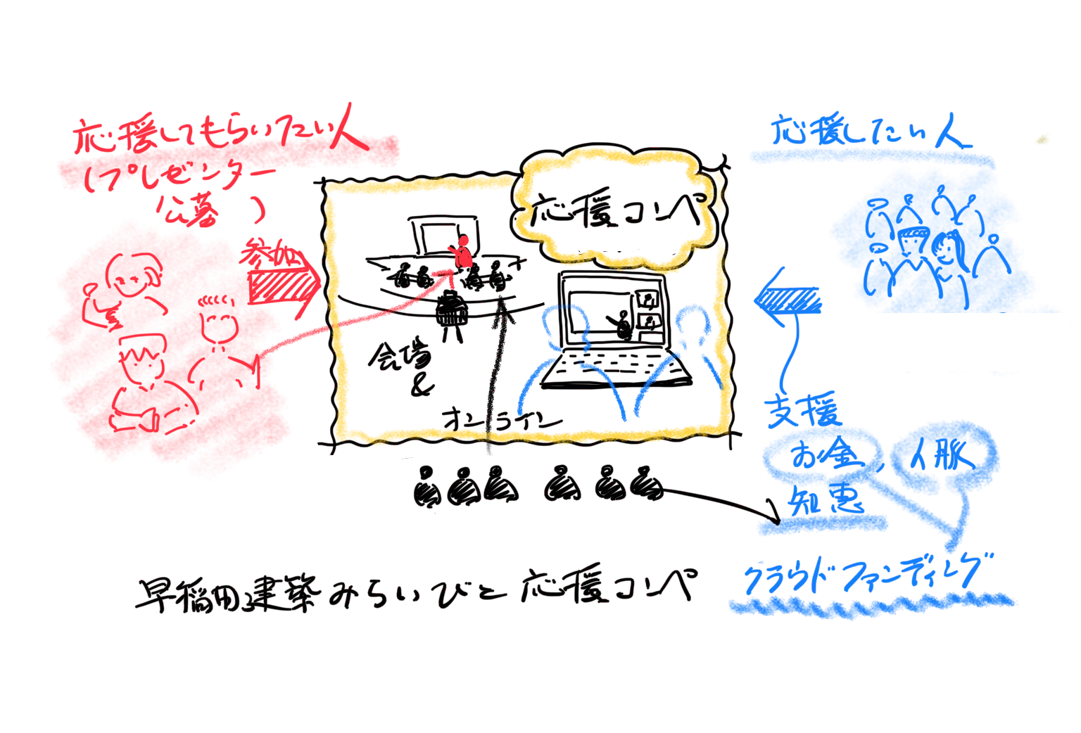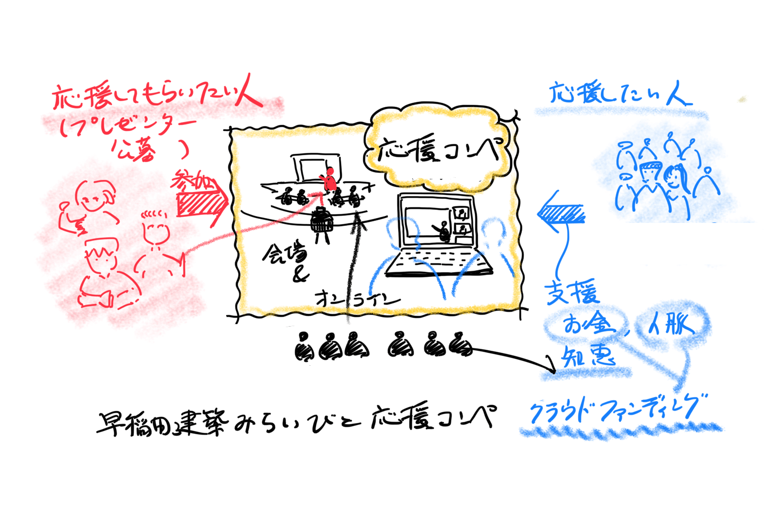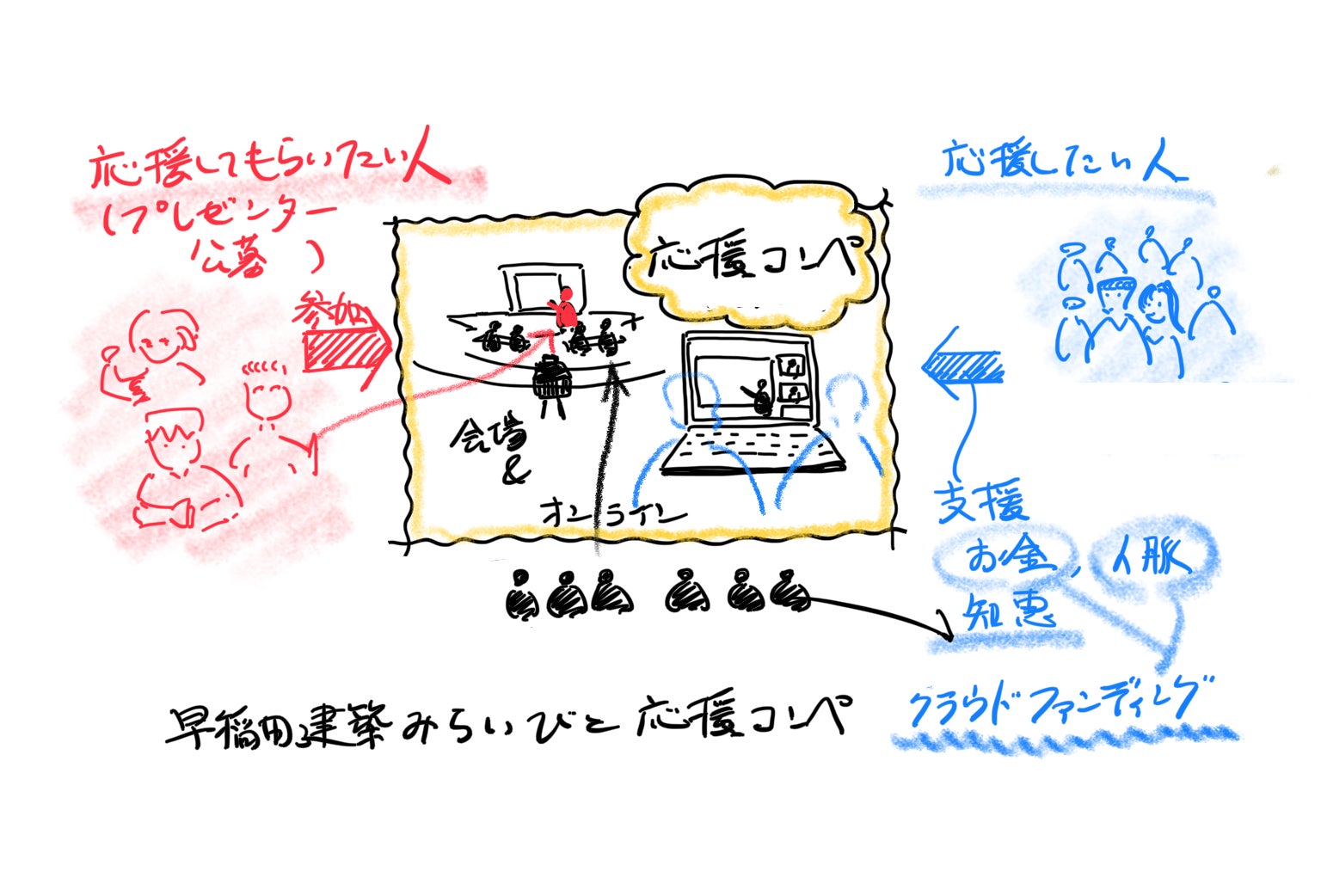 このプロジェクトで実現したい「早稲田建築みらいびと応援コンペ」の仕組みは、「建築を拡張する」新しい取り組みを始めたい有志を募り、公開プレゼンテーションでのコンペを行い、優秀提案者に対して、「みらいびと応援コンペ」実行委員会が事業計画支援を行うというものです。