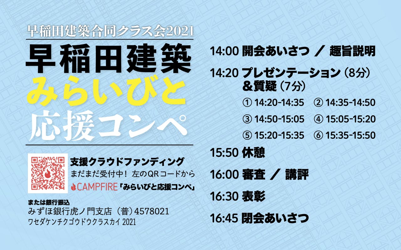 2021/11/09 10:49多くの皆様に支えられて、無事、早稲田建築みらいびとコンペ2次審査会を開催することができました。結果をご報告します!以下の4案を支援対象プロジェクトとして選出、表彰しました。(お名前は代表者のみで失礼します) 最優秀賞 「SPIN-OFF」荒川 公良さま(株式会社TOOLBOX代表取締役) 優秀賞「Path Link」徳田 華さま(古谷・藤井研 修士2年) 優秀賞「にしおぐ伸ノ市計画」千田 紘己さま(小林研 修士2年) 優秀賞「建築を二次元に拡張するアートプロジェクト」高橋 庸文さま(漫画家 座二郎)また、以下の4案を「みらいびと賞」として表彰しました。 みらいびと賞「けんちくのおそうしき」木村 寧生さま(NASCA一級建築士事務所) みらいびと賞「気候変動時代に向けた水辺実験エリア」岩本 唯史さま(株式会社水辺総研) みらいびと賞「まち『ほぐし』プロジェクト–和紙づくりの場で紡ぐ循環型里山コモンズ–」 永野 聡さま(立命館大学) みらいびと賞「カグ–る」山下 耕生さま(小岩研 修士1年)みなさまの社会への問題意識に根ざしたご提案に、楽しくも多くの学びを得ることができ、当初目指していた「多くの刺激を得て、あらたな一歩への元気をもらえるような会」が実現できたと感じました!オンラインでは、建築学科の恩師の先生方を含む、70人以上の方がリアルタイムで視聴し、意見を寄せてくれました。厚くお礼申し上げます!今後も支援会議などを開催し、提案の実現に企画者一同、微力ながら応援してまいります。以下、審査員長である田中智之(H6卒, 熊本大学教授、建築家)の講評とともに、発表の様子をご紹介します!-----審査講評公開審査会における全てのプレゼンテーションは熱意あるそして的確なものであり、どの提案にも建築拡張性、実現可能性そしてみらいびと性を感じました。その中でも最優秀に選定された「SPIN-OFF」は、建築家の設計した建築の窓などの一部分を、多くの人が使えるプロダクトとして展開しようという、その着眼の良さと面白さが特に際立っていました。また3つの評価軸において全て充実しており、実現して欲しい!と思える提案でした。どのプロダクトを扱うのか、どのように展開するのかが鍵ですので、私たちも一緒に考えたいと思います。優秀に選定された「Path Link」は女性建築家の情報交換のためのプラットフォームの提案。入念なリサーチに基づく提案には可能性を感じました。スタートアップとしてのウェブサイト立ち上げは是非実現して欲しいし、審査会でも指摘された持続することの難しさを克服していただきたいと思います。同じく優秀に選定された「にしおぐ伸ノ市計画」は既存建築における「縮店(ちぢみせ)」と伸縮する家具による「伸ノ市(のびのいち)」といった具体的提案です。家具デザインと出店内容の関係についての工夫や、防災広場との関係性も含めた開催場所の確保などを課題を克服して、ぜひ良い形で実現してもらいたいです。最後の優秀選定は「建築を二次元に拡張するアートプロジェクト」。作者は最近会社勤めをやめ、作品制作に専念されるとのこと。ぜひ、三次元である建築の特徴を際立たせるような拡張された二次元表現が新たな呼応関係をもたらす作品を期待しています。今回、実は少なかった、建築と向き合いながらものづくりを展開しようとする姿勢にエールを送ります。そのほかみらいびと賞として「気候変動時代に向けた水辺実験エリア」「まち『ほぐし』プロジェクト–和紙づくりの場で紡ぐ循環型里山コモンズ–」「カグ–る」が表彰されました。今回の支援がなくても実現を目指しているプロジェクトもあるようなので、ぜひ引く続き、頑張っていただきたいと思います。 「けんちくのおそうしき」「気候変動時代に向けた水辺実験エリア」「まち『ほぐし』プロジェクト」「カグ–る」最優秀と優秀に選定された4プロジェクトに関しては、今後実現に向けて経済的、技術的、人脈的など様々な支援を検討しています。そのプロセスや成果については出来るだけ広く発信していく予定です。ご支援いただいた皆様、応援いただいた皆様にはぜひご注目いただければ幸いです。今後ともよろしくお願いします。 もっと見る目標額達成しました!多大なるご支援感謝です!!(オンライン視聴情報)