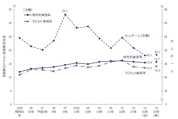 2019 年 国民生活基礎調査の概況によると、貧困世帯の割合は、子どもがいる世帯で親が一人の場合、約48.3%と非常に高い水準になっています。親が二人いた場合でも、約11.2%は貧困世帯となっています。